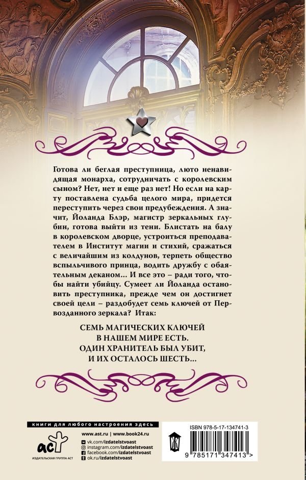 Готова ли беглая преступница, люто ненавидящая монарха, сотрудничать с королевским сыном? Нет, нет и еще раз нет! Но если на карту поставлена судьба целого мира, придется переступить через свои предубеждения. А значит, Йоланда Блэр, магистр зеркальных глубин, готова выйти из тени. Блистать на балу в королевском дворце, устроиться преподавателем в Институт магии и стихий, сражаться с величайшим из колдунов, терпеть общество вспыльчивого принца, водить дружбу с обаятельным деканом… И все это – ради того, чтобы найти убийцу. Сумеет ли Йоланда остановить преступника прежде, чем он достигнет своей цели – раздобудет семь ключей от Первозданного зеркала? Итак: