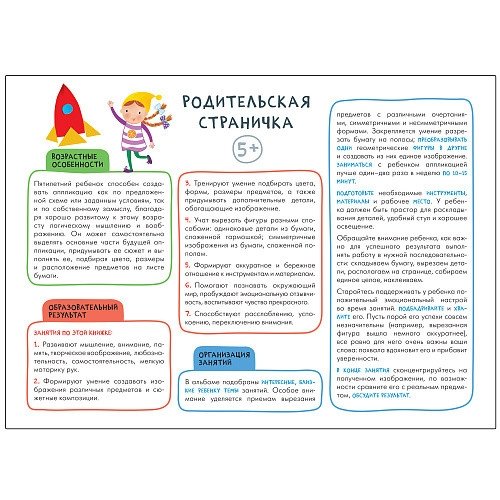 Книга «Аппликация 5+» из серии «Школа Семи Гномов. Мастерская» — это красочный альбом для занятий аппликацией с ребенком от 5 до 6 лет. Занятия на близкие и понятные ребенку темы расположены по мере усложнения: поступательно переходя от освоения простых навыков к более сложным заданиям, ребенок научится создавать аппликацию с помощью бумаги и клея.