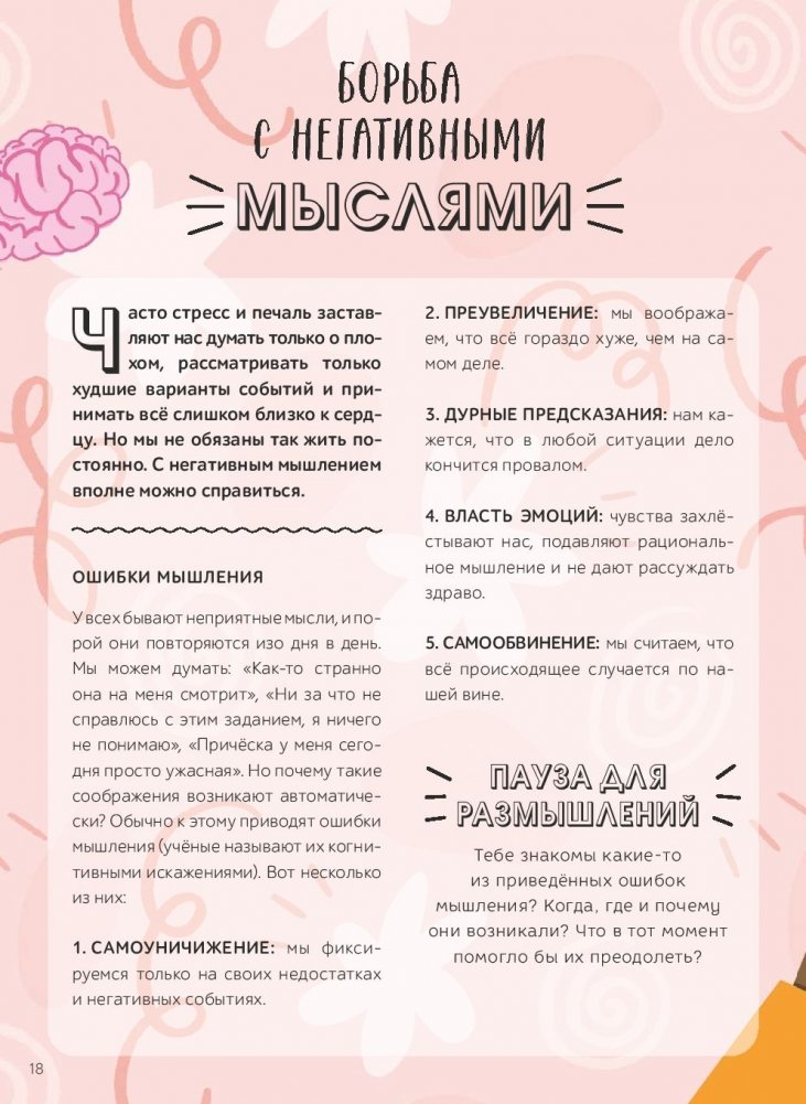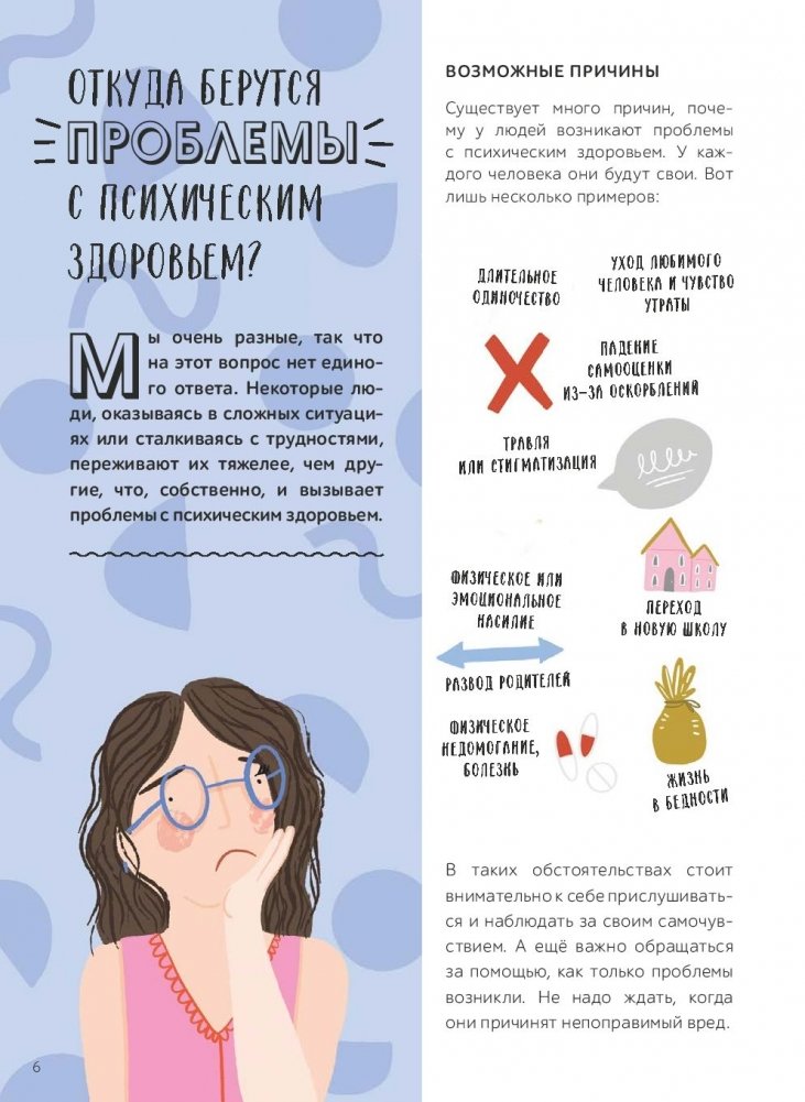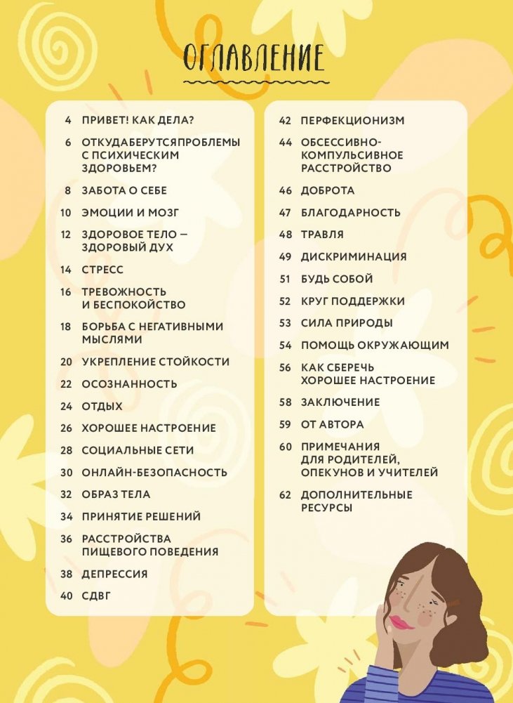 Подросток узнает, как распознать стресс, тревожность, негативные мысли, расстройство пищевого поведения, депрессию, СДВГ, перфекционизм, буллинг. И как помочь себе при помощи стойкости, осознанности, отдыха, заботы о себе, поддержки близких, добрых дел.