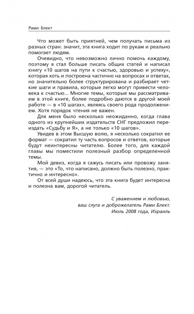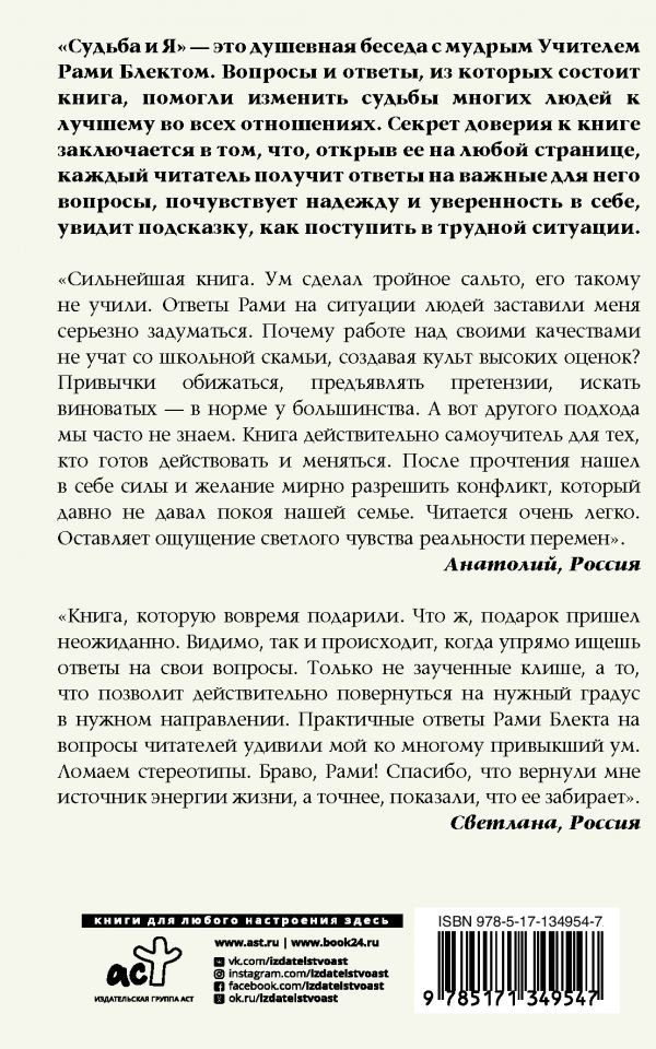 «Судьба и Я» — это душевная беседа с мудрым Учителем Рами Блектом. Вопросы и ответы, из которых состоит книга, помогли изменить судьбы многих людей к лучшему во всех отношениях. Секрет доверия к книге заключается в том, что, открыв ее на любой странице, каждый читатель получит ответы на важные для него вопросы, почувствует надежду и уверенность в себе, увидит подсказку, как поступить в трудной ситуации.