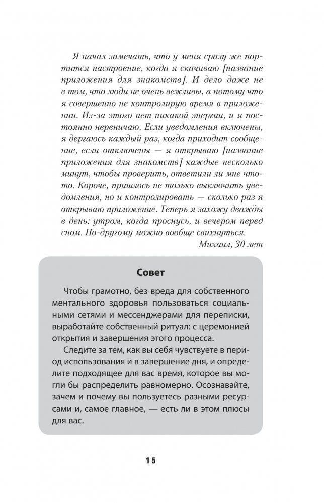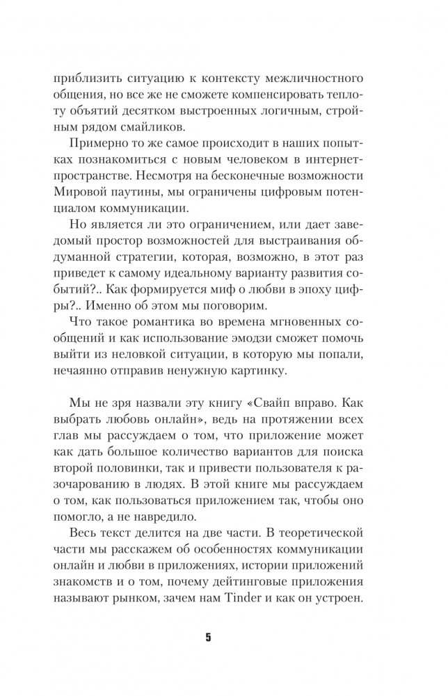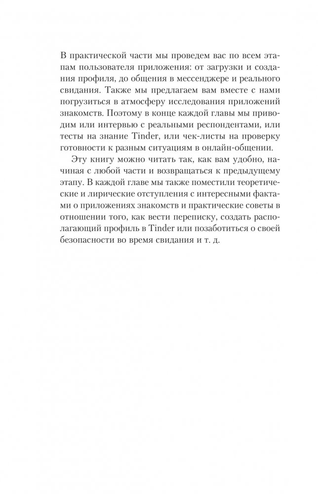 Эта книга – гайд по теории и практике любви и онлайн-знакомств. В ней вы узнаете об истории онлайн знакомств и развитии онлайн-дейтига как социальной практики. Вслед за исследователями мы находим общее в знакомствах и экономике, пытаемся понять логику самой технологии и влияние механики приложений на поиск любви онлайн. Также книга дает разнообразные практические советы, полученные на собственном опыте и в результате проведенных исследований. Вы узнаете, как конструировать профиль и общаться с потенциальными партнерами от метча до первого свидания. Мы разберем основные клише-самопрезентации пользователей и подскажем, чего лучше избегать при использовании приложения. Напоследок остается рассуждение о будущем романтической любви в эпоху усталости от Tinder.