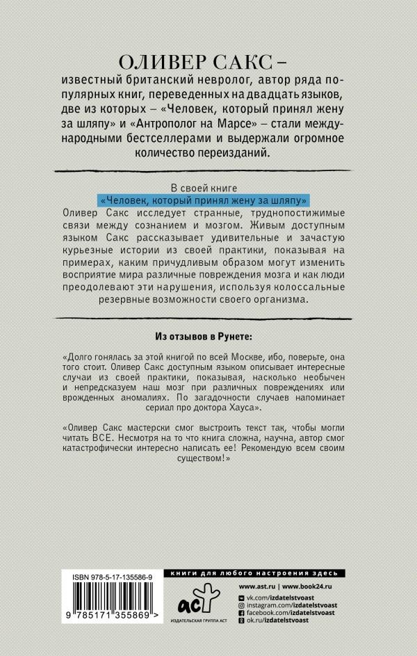 В своей книге «Человек, который принял жену за шляпу» Оливер Сакс исследует странные, труднопостижимые связи между сознанием и мозгом. Живым доступным языком Сакс рассказывает удивительные и зачастую курьезные истории из своей практики, показывая на примерах, каким причудливым образом могут изменить восприятие мира различные повреждения мозга и как люди преодолевают эти нарушения, используя колоссальные резервные возможности своего организма.