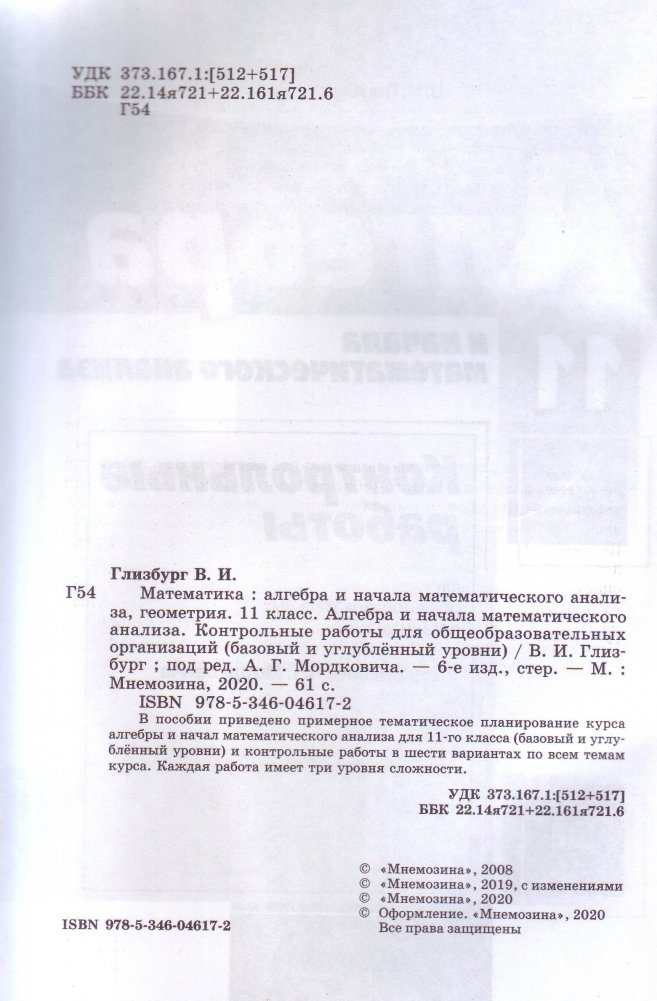 В пособии приведено примерное тематическое планирование курса алгебры и начал математического анализа для 11 класса (базовый и углубленный уровни) и контрольные работы в шести вариантах по всем темам курса. Каждая работа имеет три уровня сложности.