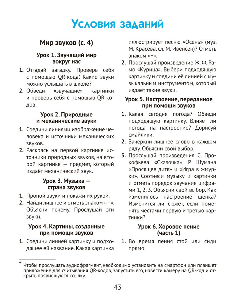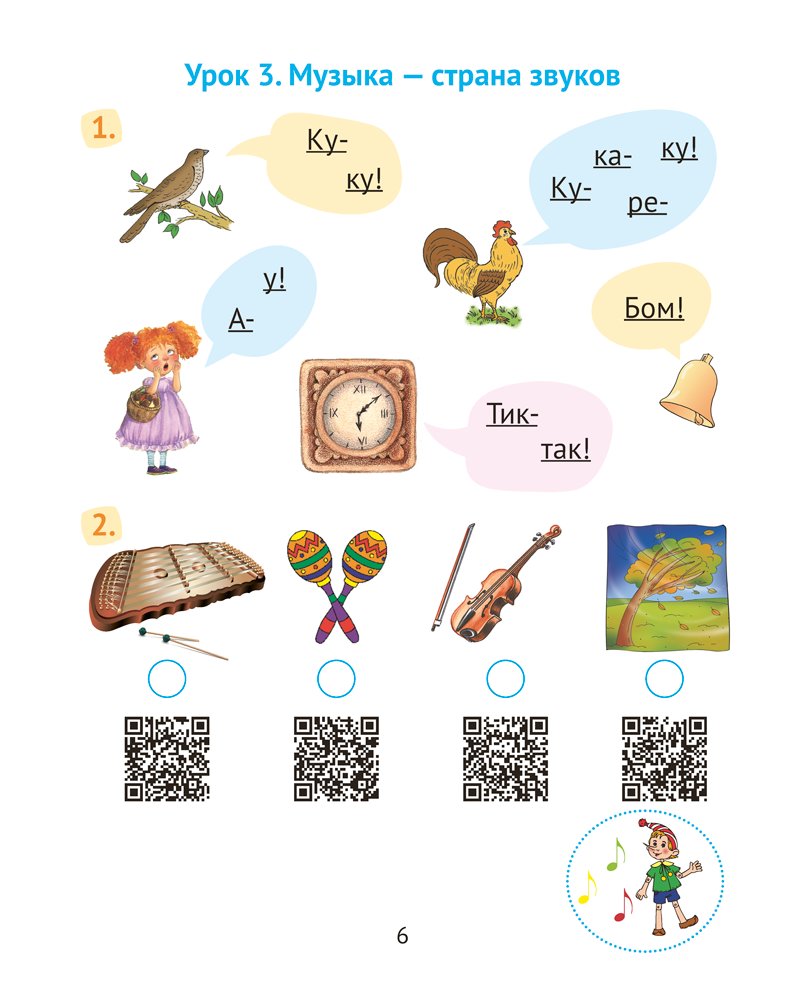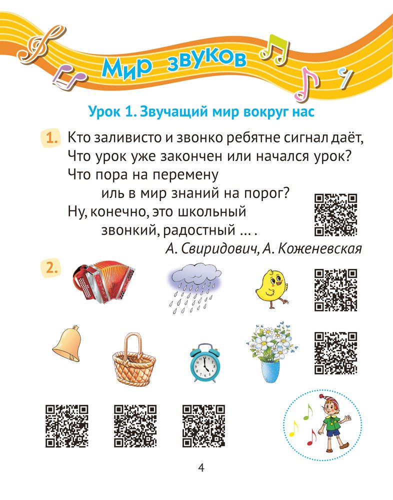 Рабочая тетрадь соответствует учебной программе по музыке и содержит разнообразные задания, направленные на развитие творческих способностей учащихся и формирование интереса к предмету. В пособии размещены QR-коды, с помощью которых первоклассники смогут послушать фрагменты музыкальных произведений и звуки природы, ознакомиться со звучанием музыкальных инструментов. На каждом уроке предусмотрена система самооценки.