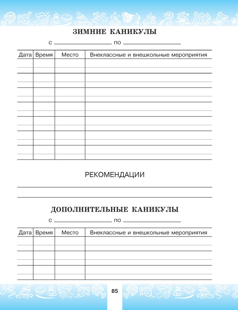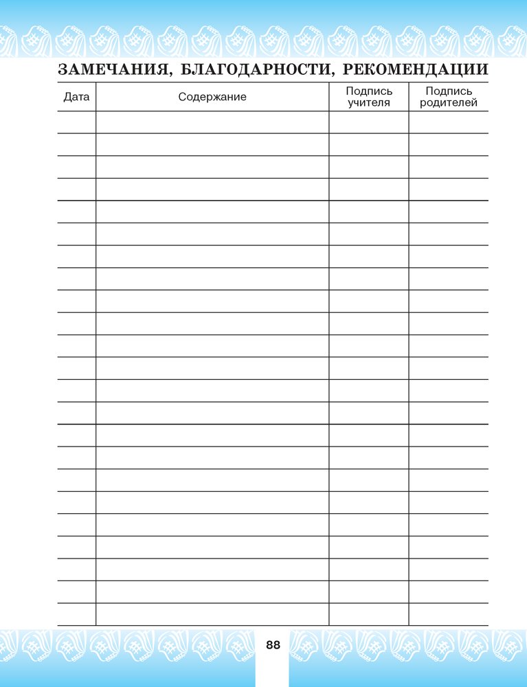 Помимо расписания уроков и домашних заданий, в «Дневничке» можно записать дополнительные мероприятия на каждую неделю, планы на каникулы, в отдельные разделы – замечания, благодарности, рекомендации учителя. В конце издания приводятся правила заполнения и ведения «Дневничка».