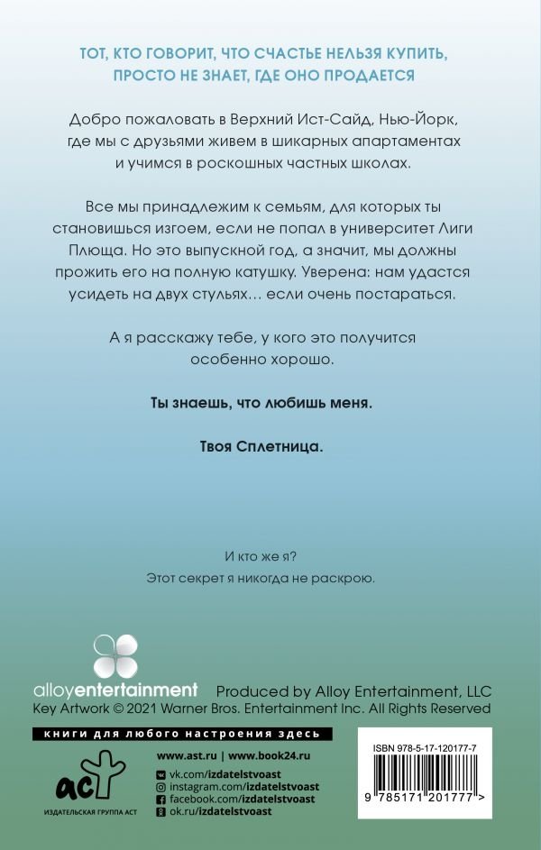 Добро пожаловать в Верхний Ист-Сайд, Нью-Йорк, где мы с друзьями живем в шикарных апартаментах и учимся в роскошных частных школах. Все мы принадлежим к семьям, для которых ты становишься изгоем, если не попал в университет Лиги Плюща. Но это выпускной год, а значит, мы должны прожить его на полную катушку. Уверена: нам удастся усидеть на двух стульях… если очень постараться. А я расскажу тебе, у кого это получится особенно хорошо.