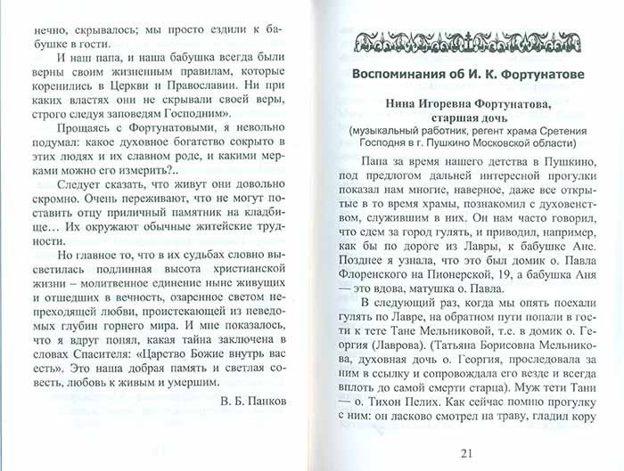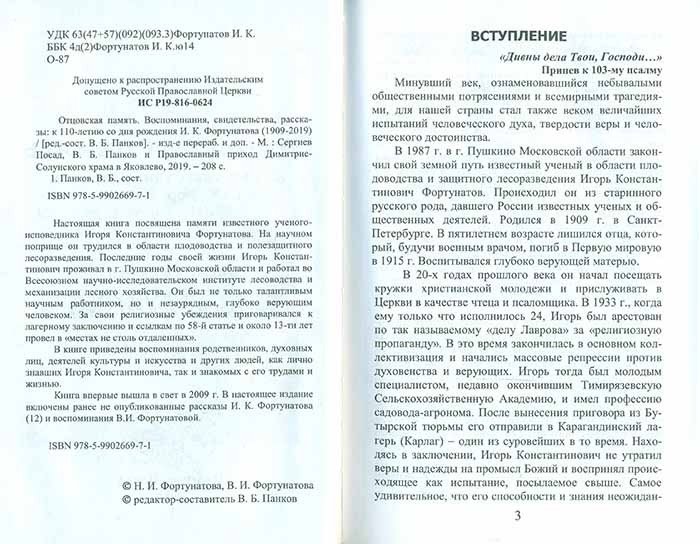 Книга «Отцовская память», подготовленная Владимиром Панковым, посвящена известному ученому-исповеднику Игорю Константиновичу Фортунатову (1909-2019). На научном поприще он трудился в области плодоводства и полезащитного лесоразведения. Последние годы своей жизни Игорь Константинович проживал в г. Пушкино Московской области и работал во Всесоюзном научно-исследовательском институте лесоводства и механизации лесного хозяйства. Он был не только талантливым научным работником, но и незаурядным, глубоко верующим человеком. За свои религиозные убеждения приговаривался к лагерному заключению и ссылкам по 58-й статье и около 13-ти лет провел в «местах не столь отдаленных».