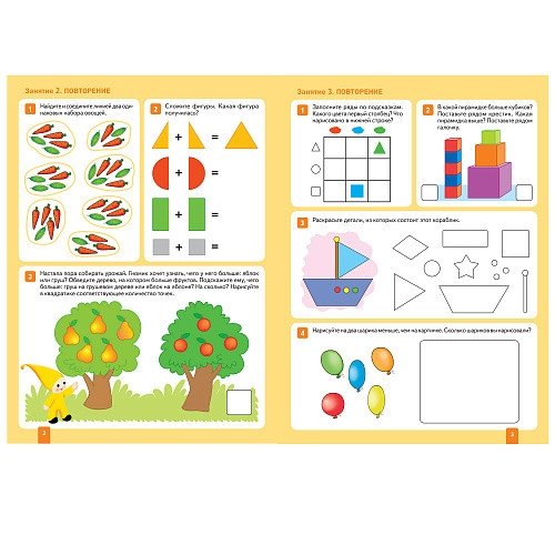 Выполняя занимательные упражнения и задания, предложенные в тетради, дети познакомятся с цифрами, научатся соотносить цифры с количеством предметов, сравнивать и объединять множества, работать со схемами, искать причинно-следственную связь между событиями, освоят порядковый счет в пределах 5. Усовершенствуют навыки ориентации на плоскости и определения направлений (налево, направо), сформируют временные представления.