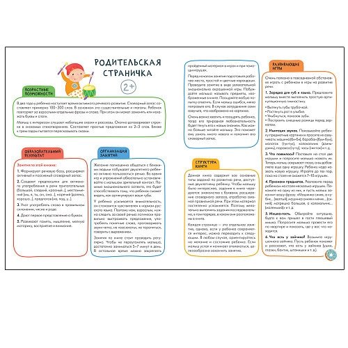 Книга «Развитие речи 2+» из серии «Школа Семи Гномов. Активити с наклейками» предназначена для развития и тренировки грамотной речи у детей от 2 до 3 лет.