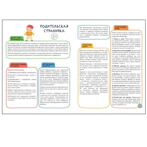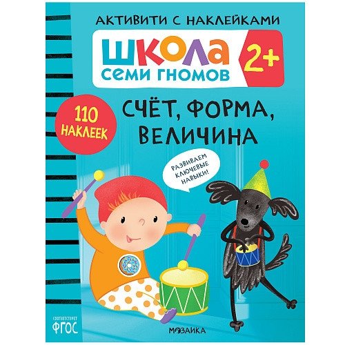Книга «Счет, форма, величина 2+» из серии «Школа Семи Гномов. Активити с наклейками» предназначена для формирования и развития у детей от 2 до 3 лет элементарных математических представлений, способности измерять величину предметов, определять их форму.