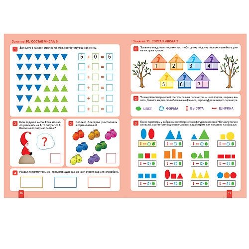 Выполняя занимательные упражнения и задания, предложенные в тетради, дети сформируют знания состава чисел первого десятка, понятия «последующее число» и «предыдущее число», освоят счет предметов в пределах двадцати, умение самостоятельно составлять задачи на основе элементарных арифметических действий по картинкам, записывать решение, решать простейшие примеры и логические задачи. Сформируют умения анализировать, обобщать, сравнивать, рассуждать, делать умозаключения и выводы. Усовершенствуют знания геометрической формы, навыки различения фигур, сравнивания предметов с учетом изученных параметров, навыки ориентирования по схемам, работы с ними, ориентирования на плоскости и в пространстве листа, сформируют временные представления (части света, времена года, последовательность месяцев, дней недели, суточные периоды, время).