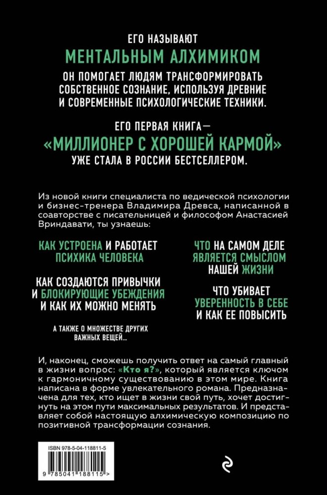 Из новой книги специалиста по ведической психологии и бизнес-тренера Владимира Древса, написанной в соавторстве с писательницей и философом Анастасией Вриндавати, ты узнаешь: как устроена и работает психика человека; что на самом деле является смыслом нашей жизни; как создаются привычки и блокирующие убеждения и как их можно менять; что убивает уверенность в себе и как ее повысить; а также о множестве других важных вещей… И наконец, сможешь получить ответ на самый главный в жизни вопрос: "Кто я?", который является ключом к гармоничному существованию в этом мире. Книга написана в форме увлекательного романа. Предназначена для тех, кто ищет в жизни свой путь, хочет достигнуть на этом пути максимальных результатов. И представляет собой настоящую алхимическую композицию по позитивной трансформации сознания.