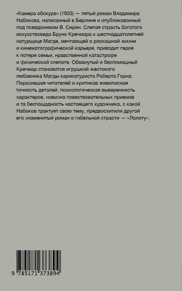 «Камера обскура» (1933) — пятый роман Владимира Набокова, написанный в Берлине и опубликованный под псевдонимом В. Сирин. Слепая страсть богатого искусствоведа Бруно Кречмара к шестнадцатилетней натурщице Магде, мечтающей о роскошной жизни и кинематографической карьере, приводит героя к потере семьи, нравственной катастрофе и физической слепоте. Обманутый и беспомощный Кречмар становится игрушкой жестокого любовника Магды карикатуриста Роберта Горна.