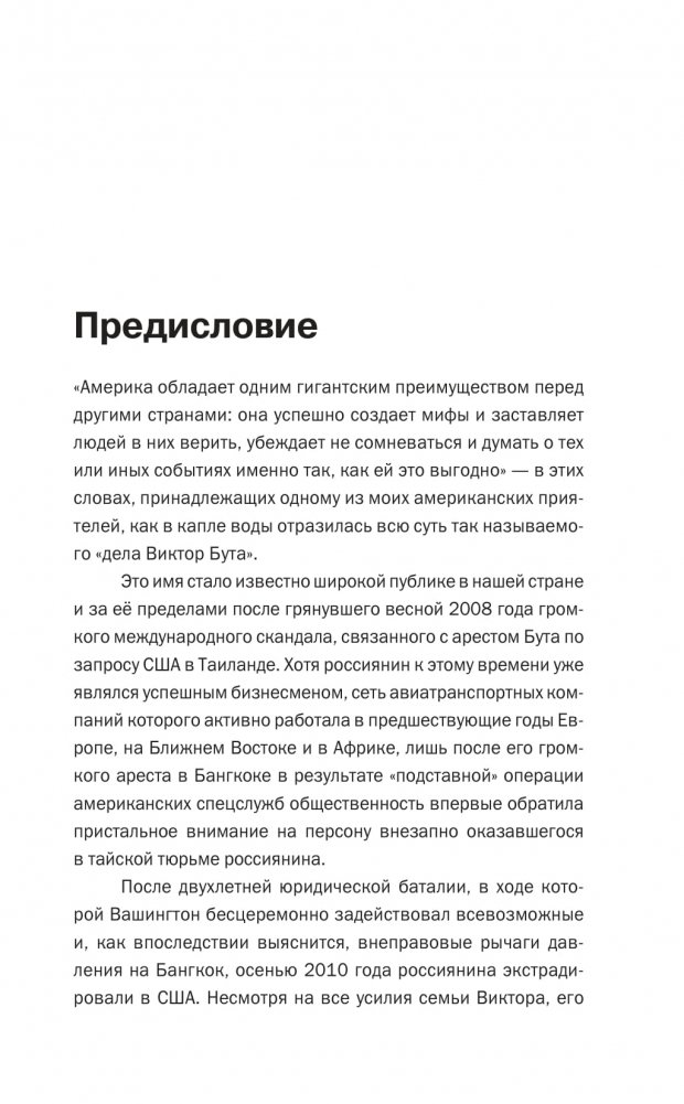 В 2008 году российский гражданин и предприниматель Виктор Бут был арестован спецслужбами США в результате проведенной на трех континентах и завершившейся в Таиланде подставной операции. Буту предъявили обвинения в сговоре против Америки. В течение двух лет, проведенных Виктором в тайской тюрьме, его судьба решалась в рамках острой дипломатической борьбы между Россией и США. После экстрадиции Бута в Нью-Йорк в 2010 году его держали в одиночной камере, подвергали психологическим пыткам, склоняли к сотрудничеству с американскими спецслужбами и требовали компромат на российских политиков. Отказ от предательства своих товарищей и Родины обернулся для Виктора приговором к 25 годам тюрьмы, которые он до сих пор отбывает в США.