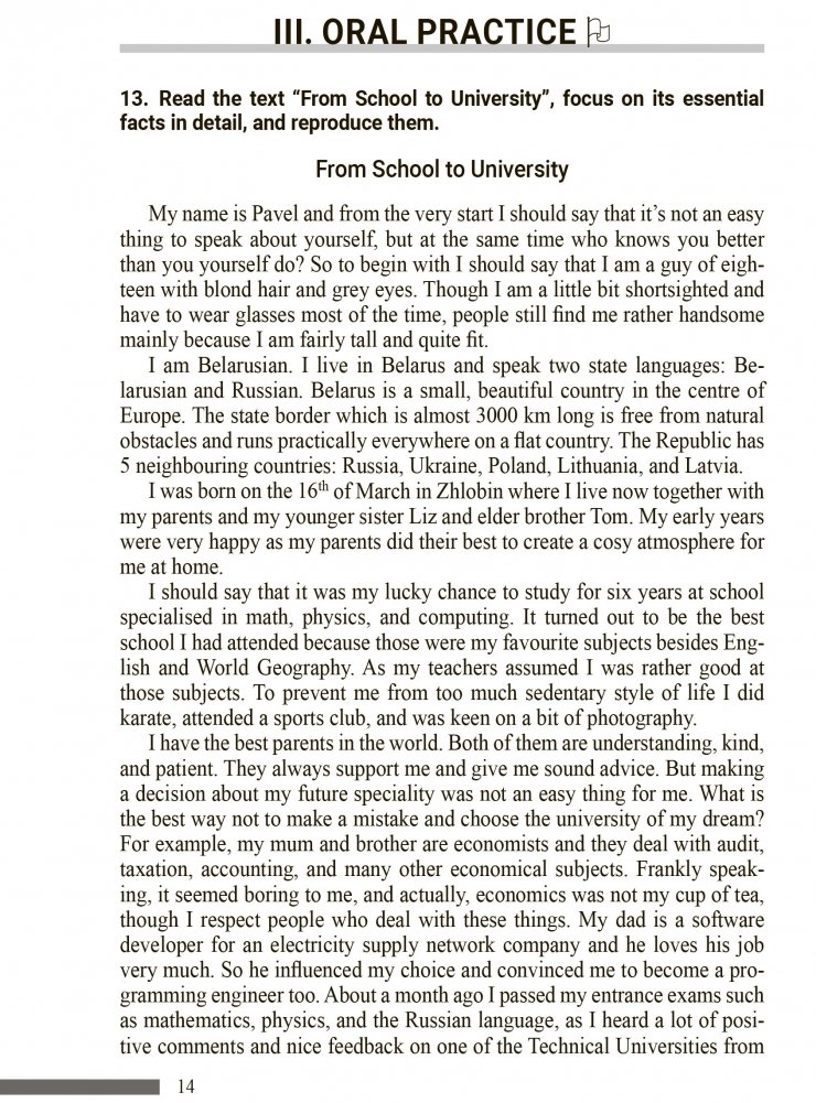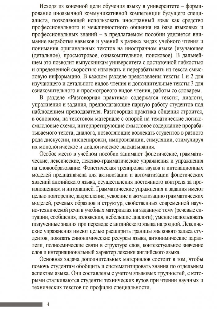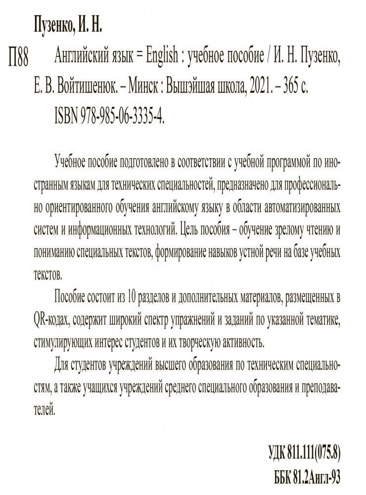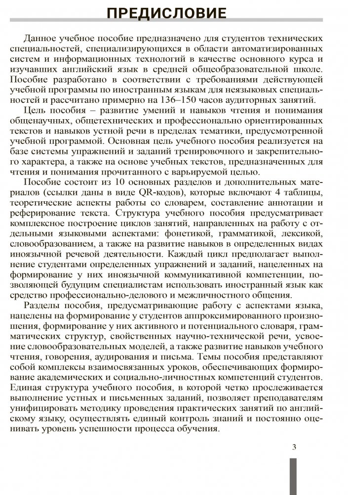 Учебное пособие подготовлено в соответствии с учебной программой по иностранным языкам для технических специальностей, предназначено для профессионально ориентированного обучения английскому языку в области автоматизированных систем и информационных технологий. Цель пособия – обучение зрелому чтению и пониманию специальных текстов, формирование навыков устной речи на базе учебных текстов. Пособие состоит из 10 разделов и дополнительных материалов, размещенных в QR-кодах, содержит широкий спектр упражнений и заданий по указанной тематике, стимулирующих интерес студентов и их творческую активность.