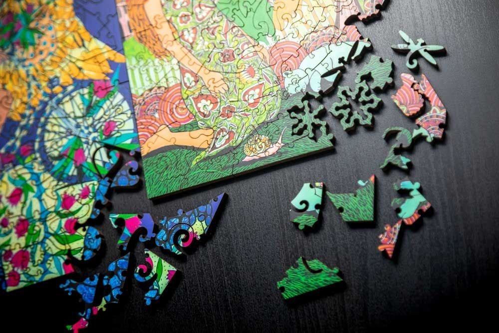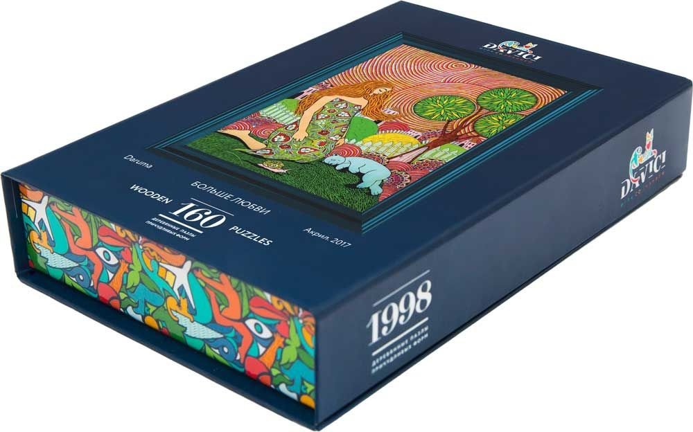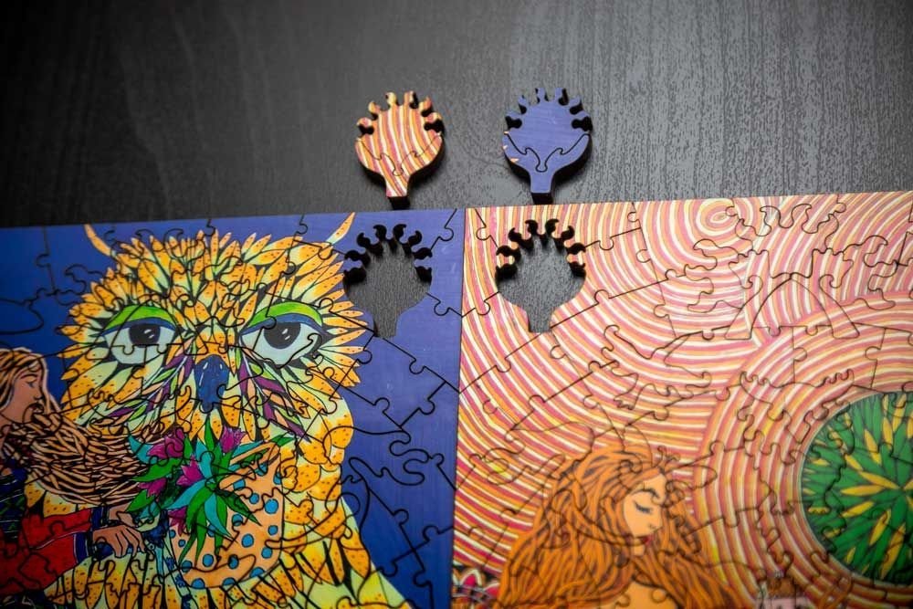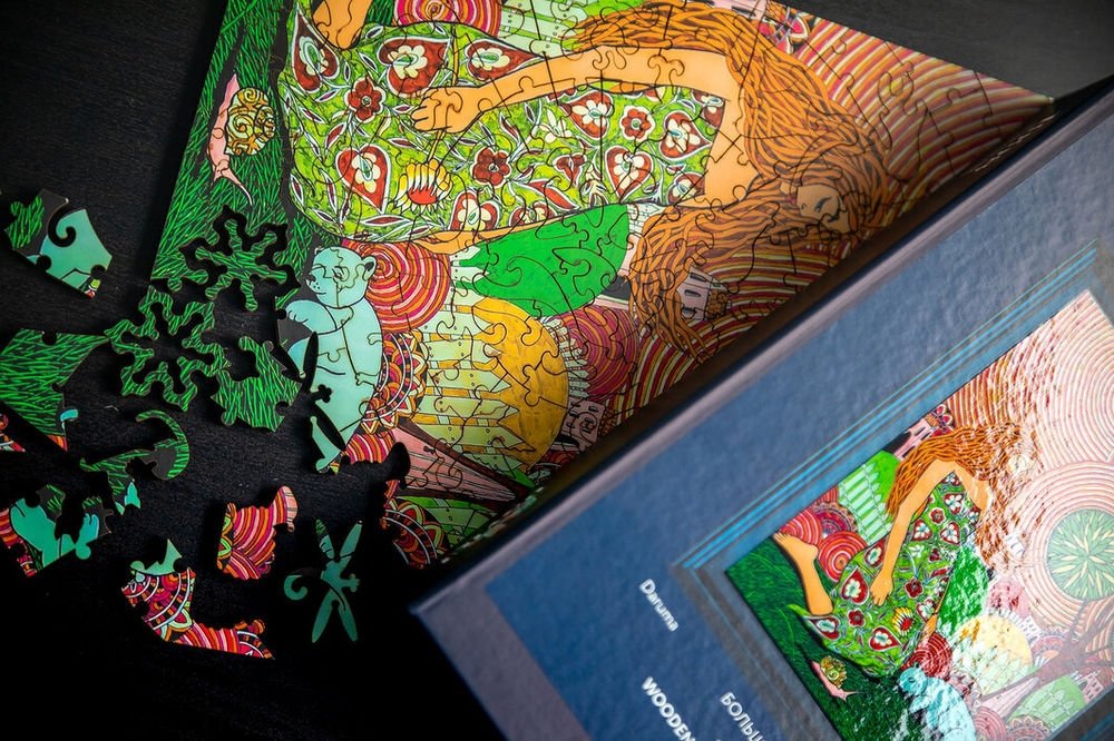 Внутри набора - картина с необычной солнечной нарезкой, олицетворяющая своими элементами мудрость и красоту окружающего мира и любовь к ближнему. Пазл является двусторонним, представлен двумя разными картинами.
