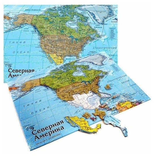 Картографический пазл "Северная Америка" возвращает нас к истокам - его кусочки вырублены по границам стран Северной Америки, что не только развивают логическое мышление, внимание, память, воображение и мелкую моторику, но и помогают лучше изучить географию.