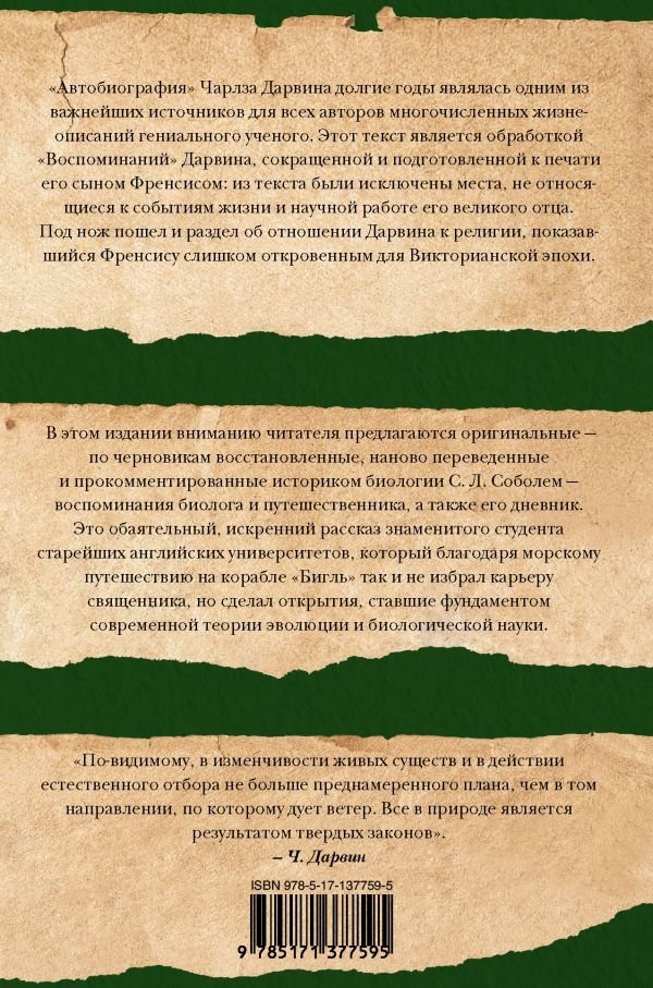 В этом издании вниманию читателя предлагаются оригинальные — по черновикам восстановленные, наново переведенные и прокомментированные историком биологии С.Л. Соболем — воспоминания биолога и путешественника, а также его дневник. Это обаятельный, искренний рассказ знаменитого студента старейших английских университетов, который — благодаря морскому путешествию на корабле "Бигль" — так и не избрал карьеру священника, но сделал открытия, ставшие фундаментом современной теории эволюции и биологической науки. "По-видимому, в изменчивости живых существ и в действии естественного отбора не больше преднамеренного плана, чем в том направлении, по которому дует ветер. Все в природе является результатом твердых законов". — Ч. Дарвин.