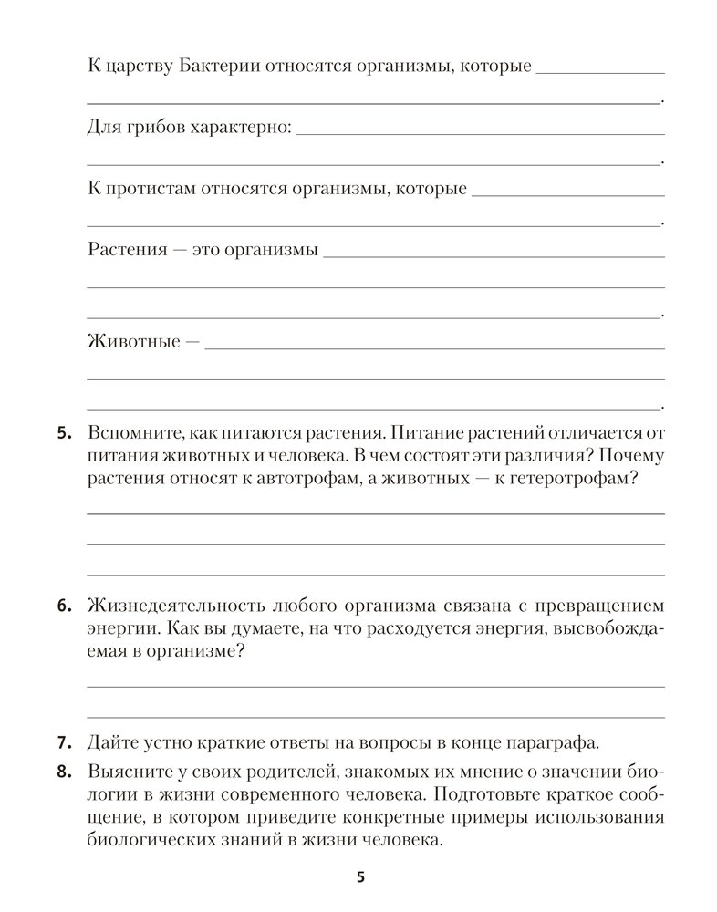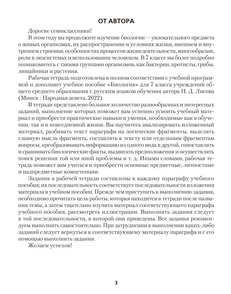Тетрадь подготовлена в соответствии с учебной программой и учебным пособием «Биология» для 7 (автор Н. Д. Лисов). Ее использование в учебном процессе будет способствовать достижению каждым учеником уровня обязательной подготовки по биологии, а также поможет сформировать умение применять полученные знания на практике.