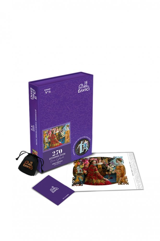 За цветами и геометрией узоров парадного портрета скрыты истории дам и кавалеров из галантного и изысканного столетия. Фигурный рез пазла подобен музею эпохи: внутри цветочного орнамента скрыты герои творений Рембрандта. Цветочные орнаменты по всему периметру набора изящно венчают сюжетную линию картины. Внутри набора в истории жизни эпохи дам и кавалеров - в динамичном сюжете из дуэлей и любовных драм.
