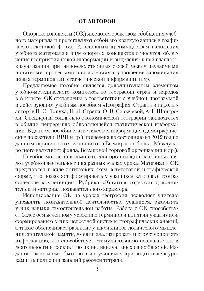 В пособии представлены опорные конспекты, схемы и таблицы, систематизирующие учебный материал по географии в 8 классе. Они составлены в соответствии с учебным пособием «География. Страны и народы» авторов П. С. Лопуха и др. Опорные конспекты облегчат восприятие новой информации, визуализируют причинно-следственные связи, упростят запоминание статистических данных и терминов. С помощью пособия учителя смогут отобрать наиболее важный учебный материал для проведения уроков. Издание может быть также полезно учащимся при подготовке к урокам и выполнении заданий рабочей тетради.