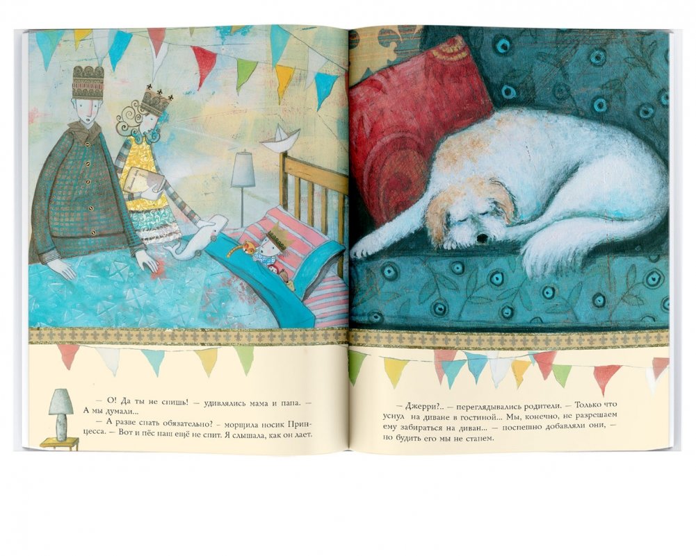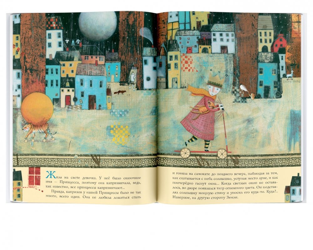 «Разве спать обязательно?» – спрашивает маленькая девочка по имени Принцесса. И родители рассказывают ей об улитках, которые, засыпая, сворачиваются клубочком, и об огромных китах, которые водят во сне хороводы, о кошке, пригревшейся в гостиной, и о медведе, который спит целую длинную зиму. А как спит тигр? Принцесса представляет тёплого рыжего зверя и, наконец, засыпает...