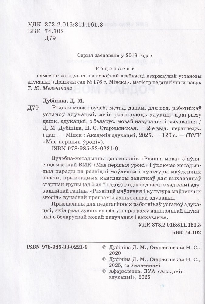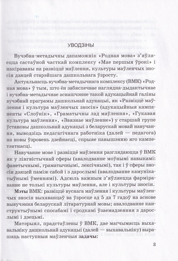 Вучэбна-метадычны дапаможнік "Родная мова з'яўляецца часткай ВМК "Мае першыя ўрокі" і ўключае метадычныя парады па развіцці маўлення і культуры маўленчых зносін, прыкладныя канспекты заняткаў для выхаванцаў старшай групы (ад 5 да 7 гадоў) у адпаведнасці з задачамі адукацыйнай галіны "Развіццё маўлення і культура маўленчых зносін" вучэбнай праграмы дашкольнай адукацыі.