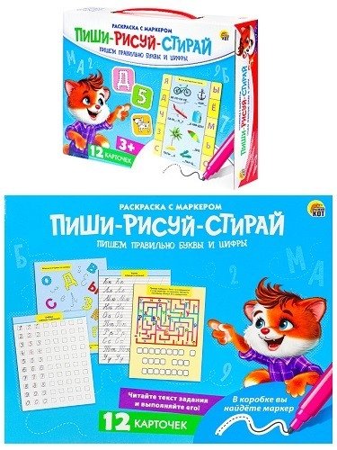 Раскраска с маркером "Пиши-рисуй-стирай", пишем правильно буквы и цифры (новая коробка)