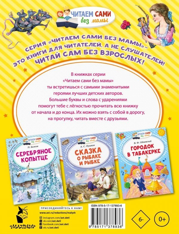 В книгах серии «Читаем сами без мамы» вы найдёте подборку самых лучших произведений, с которыми каждый должен познакомиться ещё в детстве. Большие буквы и слова с ударениями помогут ребёнку с лёгкостью прочитать книгу "от корки до корки". Её можно взять с собой в дорогу, на прогулку, читать вместе с друзьями. В этой книге малыш прочитает чудесную сказку Э.Т.А. Гофмана "Щелкунчик и Мышиный король" и поймёт, что дружба помогает делать настоящие чудеса.