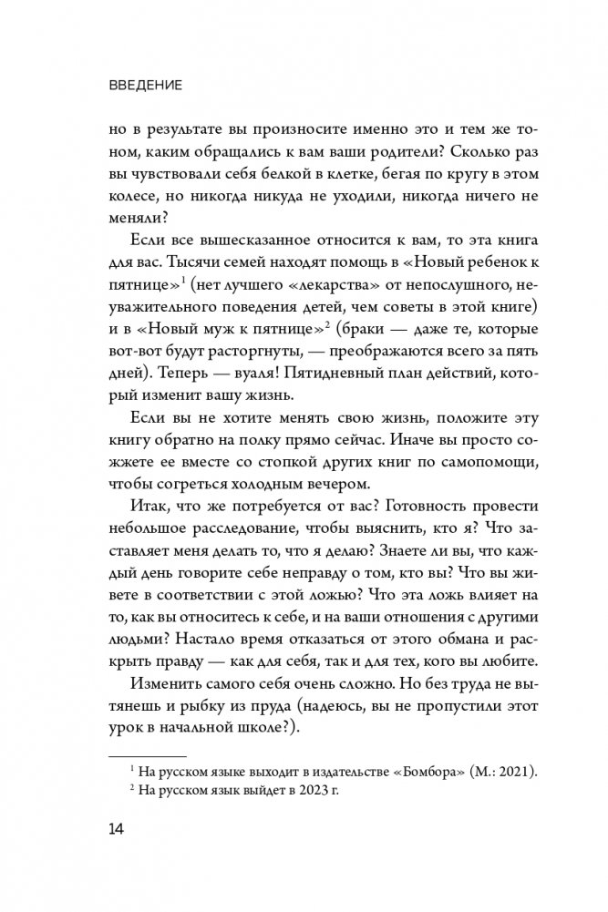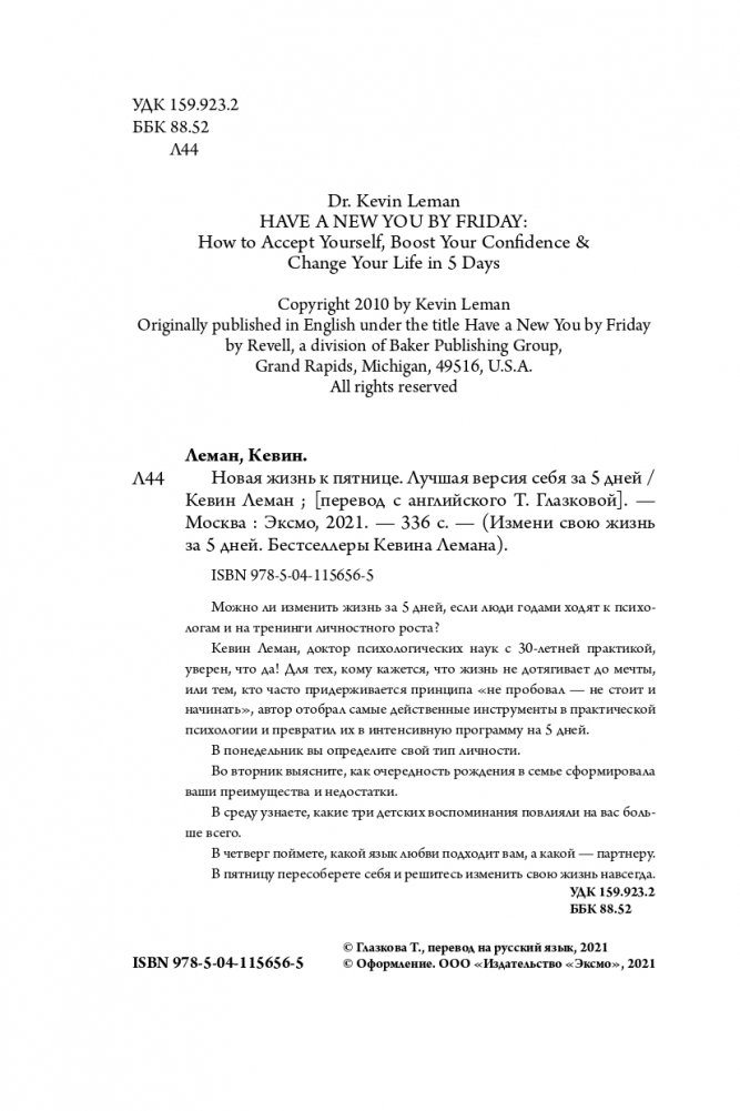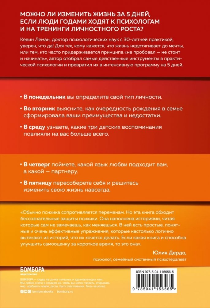 ЛУЧШИЕ ПСИХОЛОГИЧЕСКИЕ ПРАКТИКИ — В ОДНОЙ КНИГЕ Можно ли изменить жизнь за 5 дней, если люди годами ходят к психологам и на тренинги личностного роста? Кевин Леман, доктор психологических наук с 30-летней практикой, уверен, что да! Для тех, кому кажется, что жизнь не дотягивает до мечты, или тем, кто часто придерживается принципа «не пробовал — не стоит и начинать», автор отобрал самые действенные инструменты в практической психологии и превратил их в интенсивную программу на 5 дней. В понедельник вы определите ой тип личности. Во вторник выясните, как очередность рождения в семье сформировала ваши преимущества и недостатки. В среду узнаете, какие три детских воспоминания повлияли на вас больше всего. В четверг поймете, какой язык любви подходит вам, а какой — партнеру. В пятницу пересоберете себя и решитесь изменить свою жизнь навсегда. ОТЗЫВ: «Можно нагуглить миллион упражнений для поднятия самооценки, но мы этого не делаем. Потому что любая психика сопротивляется переменам. Но эта книга обходит бессознательные защиты психики. Она наполнена историями, читая которые, сам не замечаешь, как меняешься. В ней есть простые, понятные и очень эффективные упражнения, которые настолько логично вытекают из историй, что их хочется делать. Если какая книга и способна улучшить самооценку за короткое время, то это она». — Юлия Дердо, психолог, семейный системный психотерапевт