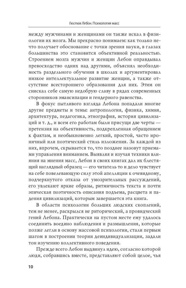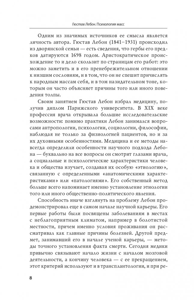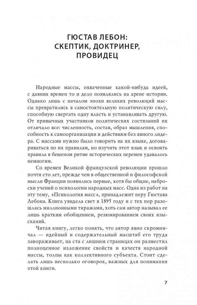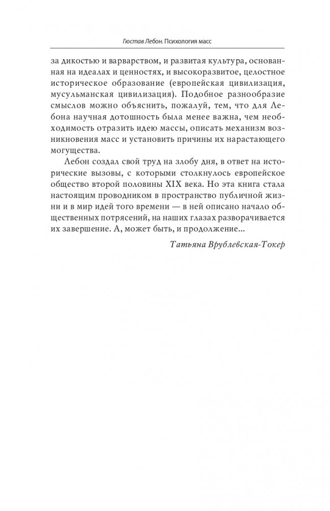 Лебон создал свой труд на злобу дня, в ответ на исторические вызовы, с которыми столкнулось европейское общество второй половины XIX века. Но эта книга стала настоящим проводником в пространство публичной жизни и в мир идей того времени — в ней описано начало общественных потрясений, на наших глазах разворачивается их завершение. А может быть, и продолжение... — Татьяна Врублевская-Токер