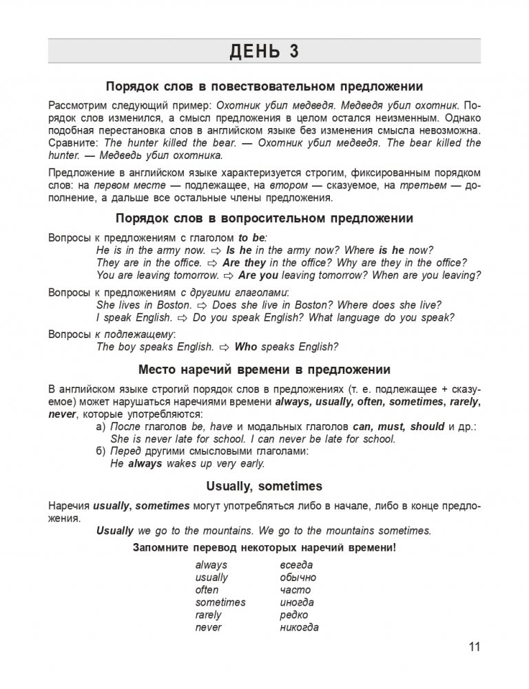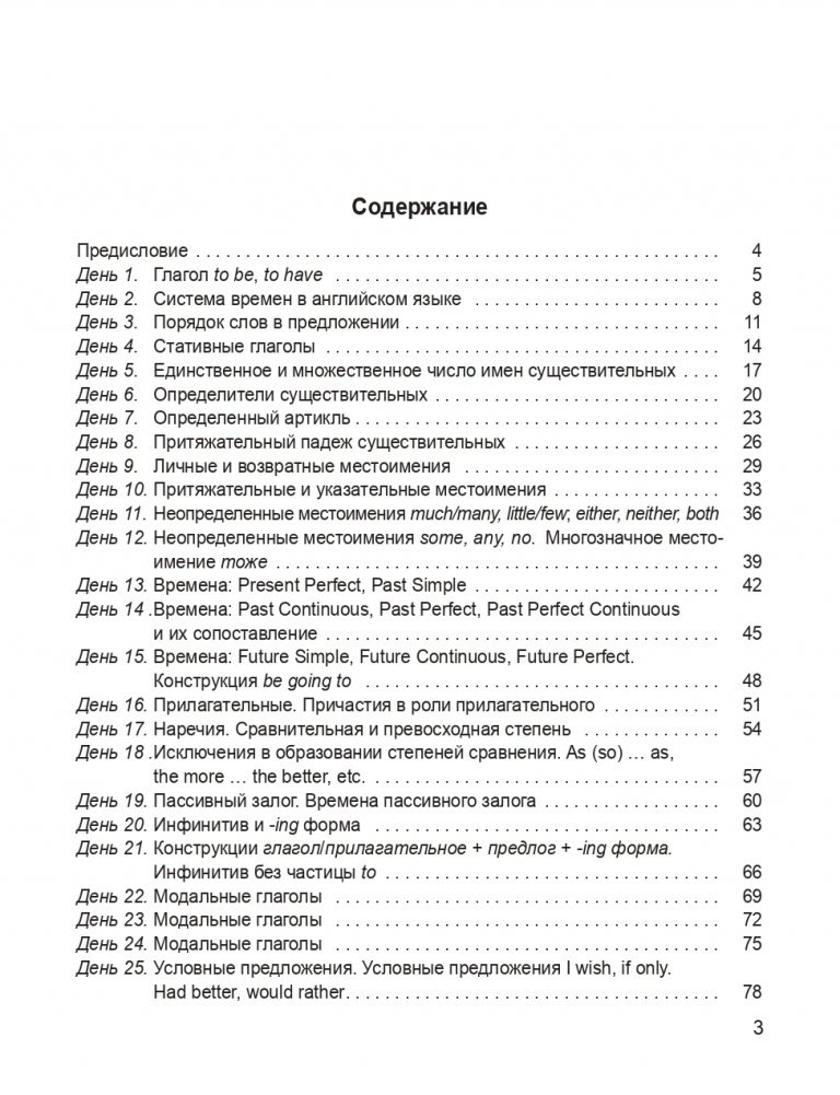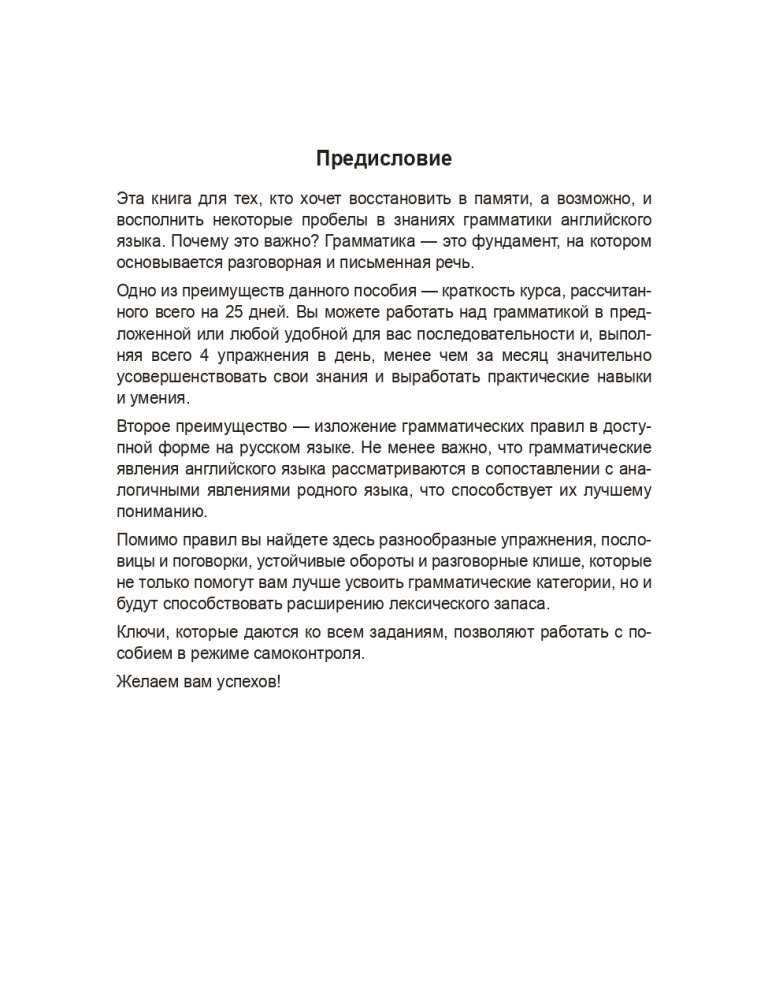 Пособие посвящено усовершенствованию практических навыков использования английского языка. Оно дает возможность поработать над грамматикой в формате, доступном каждому читателю. Всего за 25 дней вы сумеете освежить в памяти основные грамматические правила и потренироваться применять их на практике с помощью различных упражнений. Систематически выполняя по 4 задания в предложенной авторами последовательности, менее чем за месяц вы достигнете высокого уровня языковой подготовки.