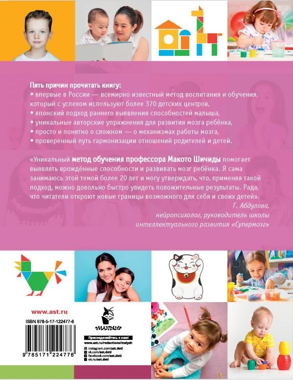 Метод обучения Макото Шичиды, представленный в книге, помогает выявлять врождённые способности и развивать их, когда это проще всего сделать, то есть в детстве. Макото Шичида — доктор педагогических наук, всемирно известный эксперт по дошкольному и школьному образованию, автор метода правополушарного обучения. Его книги переведены на многие языки, его методиками пользуются более чем в 300 детских центрах по всему миру. Эта книга, известная во всём мире, содержит основные иди автора. Простым и понятным языком в ней объясняется, как с раннего детства развивать мозг ребёнка и выявлять его способности.