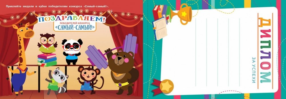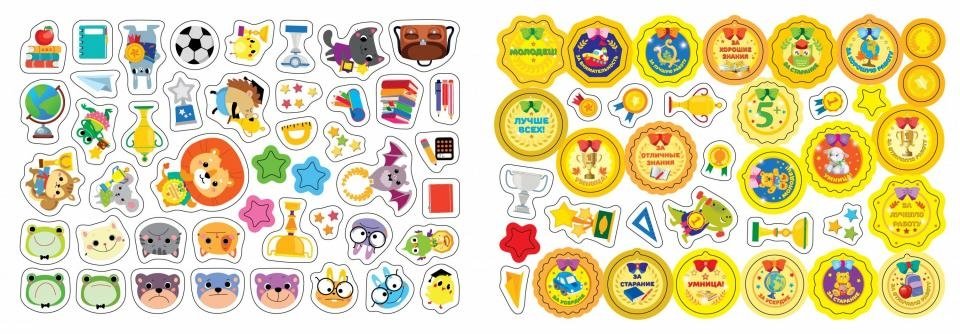 Очень важно похвалить ребёнка за его усердие, оценить его достижения и подтолкнуть к новым свершениям. Помогут в этом веселые стикеры. Поощрительные наклейки и медали, кубки и награды, смайлики с разными эмоциями - все это вы найдете в нашей книжке. А еще здесь есть дипломы и грамоты. Украсьте их наклейками и вручите, кому захочется.