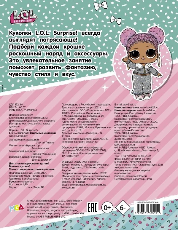 Книжечка для юных модниц. Внутри целый гардероб для двух куколок. Тебе предстоит одеть их самой! Придумывай самые необычные и отпадные костюмы, импровизируй, играйся с комбинациями цветов и принтов. Пастельные юбочки, градиентные топы, кошачьи ушки и множество аксессуаров. Куколку можно одеть десятками разных способов! Вдохновляйся на модные эксперименты и развивай чувство стиля и фантазию. Куколки L.O.L.Surprise! всегда выглядят потрясающе! Подбери каждой крошке роскошный наряд и аксессуары. Это увлекательное занятие поможет развить фантазию, чувство стиля и вкус!