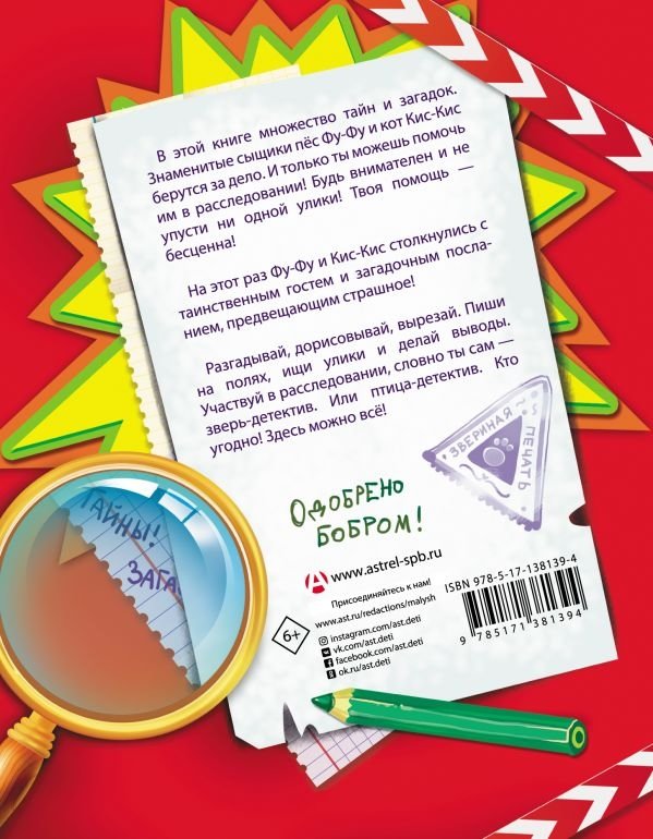 В этой книге множество тайн и загадок. Знаменитые сыщики пёс Фу-Фу и кот Кис-Кис берутся за дело. И только ты можешь помочь им в расследовании! Будь внимателен и не упусти ни одной улики! Твоя помощь — бесценна!