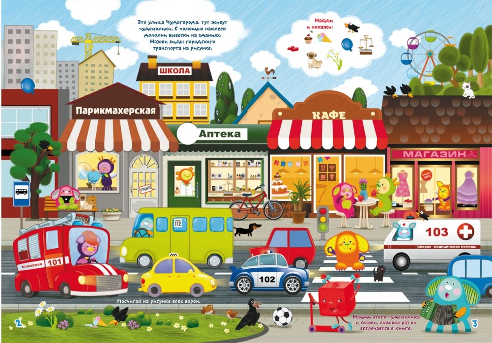Сколько всего интересного в городе: музей, зоопарк, цирк! Забавные чудомолики хотят везде побывать и обо всём узнать. Учимся, считаем, рисуем и играем со 100 развивающими наклейками.
