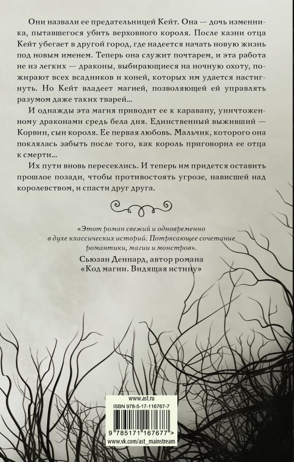 Они назвали ее предательницей Кейт. Она — дочь изменника, пытавшегося убить верховного короля. После казни отца Кейт убегает в другой город, где надеется начать новую жизнь под новым именем. Теперь она служит почтарем, и эта работа не из легких — драконы, выбирающиеся на ночную охоту, пожирают всех всадников и коней, которых им удается настигнуть. Но Кейт владеет магией, позволяющей ей управлять разумом даже таких тварей…