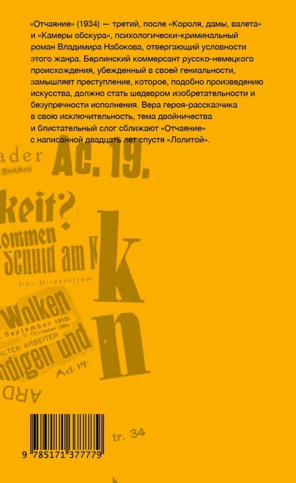 «Отчаяние» (1934) — шестой роман Владимира Набокова, написанный в Берлине, и его третий, после «Короля, дамы, валета» и «Камеры обскура», психологически-криминальный роман, отвергающий условности этого жанра. Герман, берлинский коммерсант русско-немецкого происхождения, убежденный в своей гениальности, замышляет преступление, которое, подобно произведению искусства, должно стать шедевром изобретательности и безупречности исполнения. Жизнь, однако, оказывается намного остроумнее и художественней порочного замысла, кривое зеркало которого лишь искажает реальность.