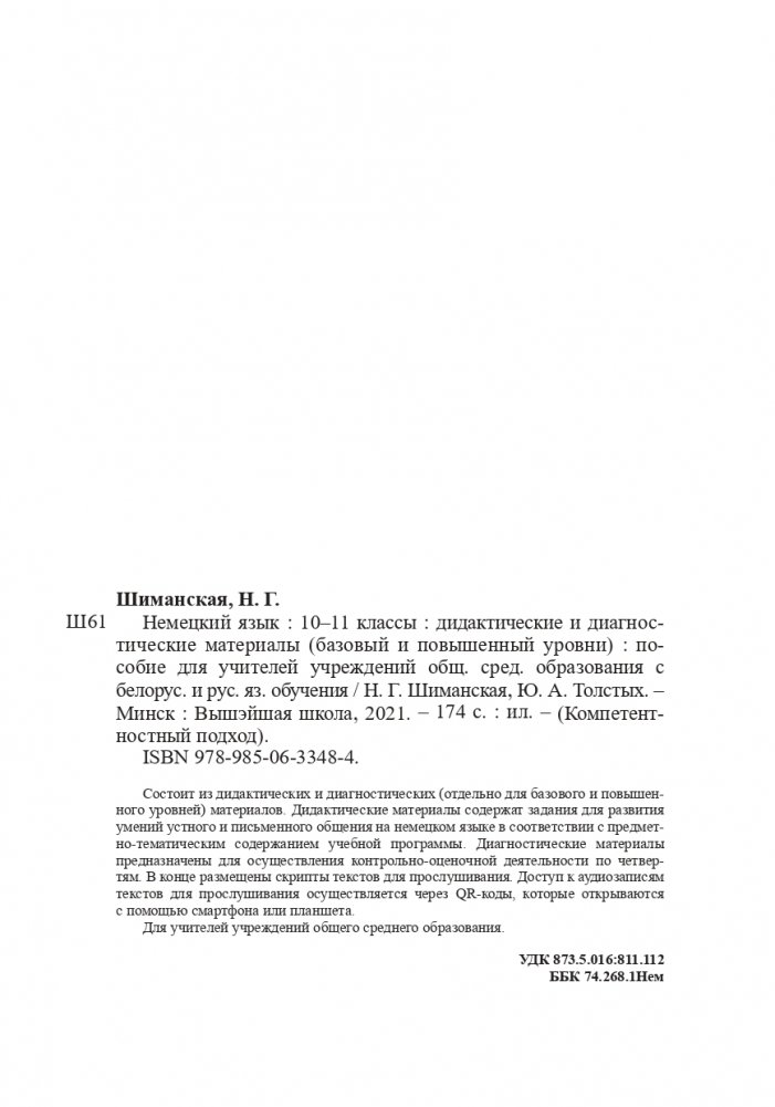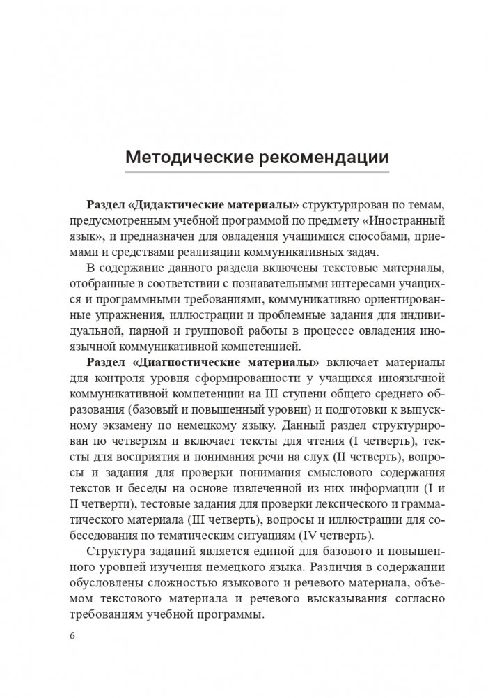 Состоит из дидактических и диагностических (отдельно для базового и повышенного уровней) материалов. Дидактические материалы содержат задания для развития умений устного и письменного общения на немецком языке в соответствии с предметно-тематическим содержанием учебной программы. Диагностические материалы предназначены для осуществления контрольно-оценочной деятельности по четвертям. В конце размещены скрипты текстов для прослушивания. Доступ к аудиозаписям текстов для прослушивания осуществляется через QR-коды, которые открываются с помощью смартфона или планшета.