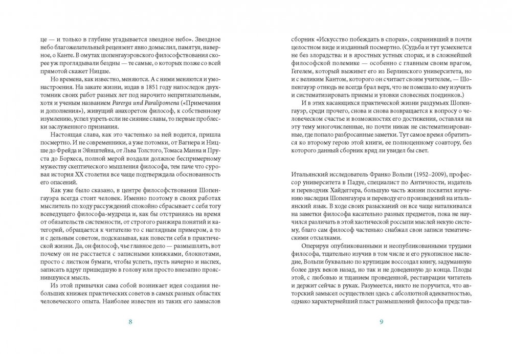 Составитель книги, итальянский историк философии Франко Вольпи (1952–2009), собрал наиболее яркие высказывания Шопенгауэра на тему счастья из опубликованных и рукописных источников.