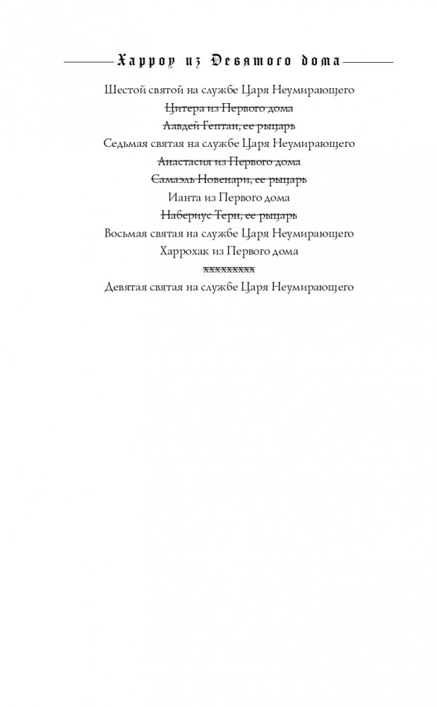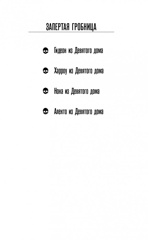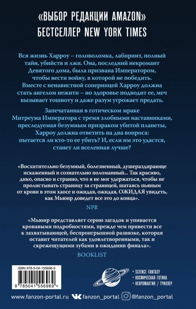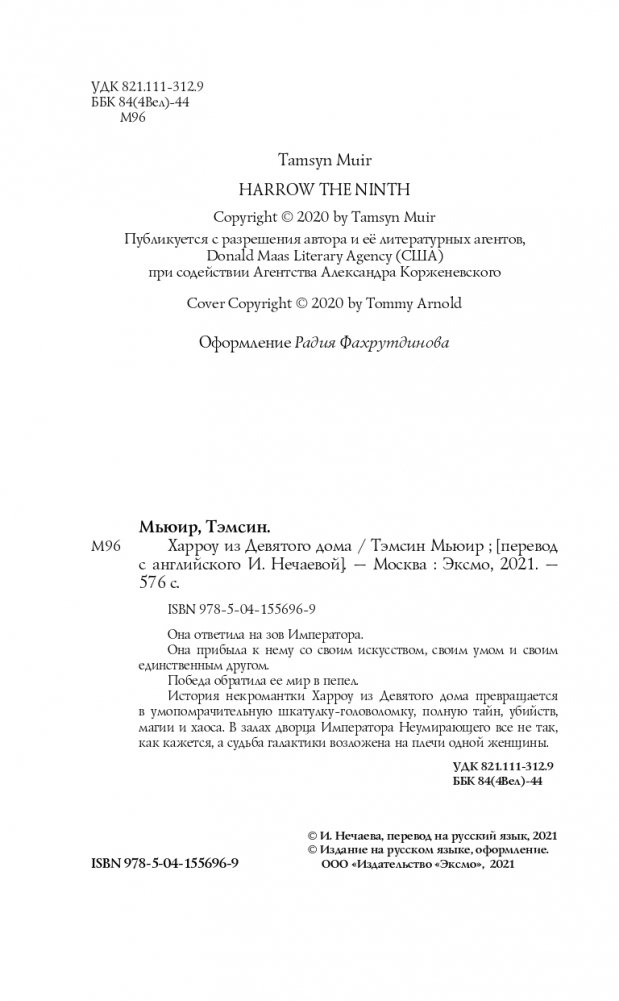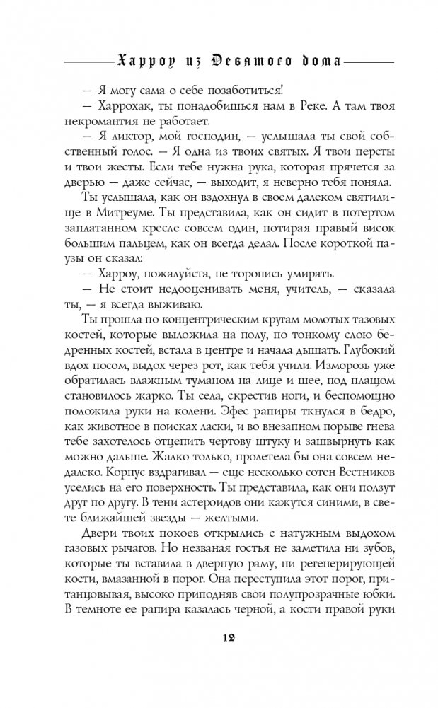 Вся жизнь Харроу — головоломка, лабиринт, полный тайн, убийств и лжи. Она — последний некромант Девятого дома, была призвана Императором, чтобы вести войну, в которой не победить. Вместе с ненавистной соперницей Харроу должна стать ангелом нежити — но здоровье подводит ее, меч вызывает тошноту, и даже разум угрожает предать. Запечатанная в готическом мраке Митреума Императора с тремя злобными наставниками, преследуемая безумным призраком убитой планеты, Харроу должна ответить на два вопроса: пытается ли кто-то ее убить? И, если им это удастся, станет ли вселенная лучше? «Читать ХАРРОУ ИЗ ДЕВЯТОГО ДОМА — значит, войти в лабиринт, полный потерь и жертв. Но не беспокойтесь о хлебных крошках или красной путеводной нити — вам никогда не захочется из него выйти». — Аликс Э. Харроу «Роман — психологические "американские горки", охватывающие сорок миллиардов световых лет. Замечательно видеть, как расширяется вселенная Гидеон, оставаясь при этом такой же закрученной и полной костей, как и всегда». — Джанго Векслер «Безумно блестяще». — Кирстен Уайт «Терпеливый читатель будет десятикратно вознагражден блестящими оригинальными персонажами и магией, душераздирающей близостью, юмором и лучшим в галактике чертовски хорошим супом». — Ребекка Роанхорс «Восхитительно безумный, болезненный, душераздирающе искаженный и сознательно поломанный... Так красиво, дико, опасно и странно, что я не мог удержаться, чтобы не пролистывать страницу за страницей, шатаясь пьяным от крови в этом хаосе и ожидая, ожидая, ОЖИДАЯ увидеть, как Мьюир доведет все это до конца». — NPR «Невероятное путешествие в хаос разума, умножает на два все удивительно странные и мясные моменты, бодихоррор и жутковатый юмор ее дебюта — и превосходит его». — Library Journal «Эта темная, кровавая шкатулка-головоломка с продолжением сногсшибательна». — Publishers Weekly «Мьюир представляет серию загадок и упивается кровавыми подробностями, прежде чем привести все к захватывающей, беспроигрышной развязке, которая оставит читателей как удовлетворенными, так и скрежещущими зубами в ожидании финала». — Booklist