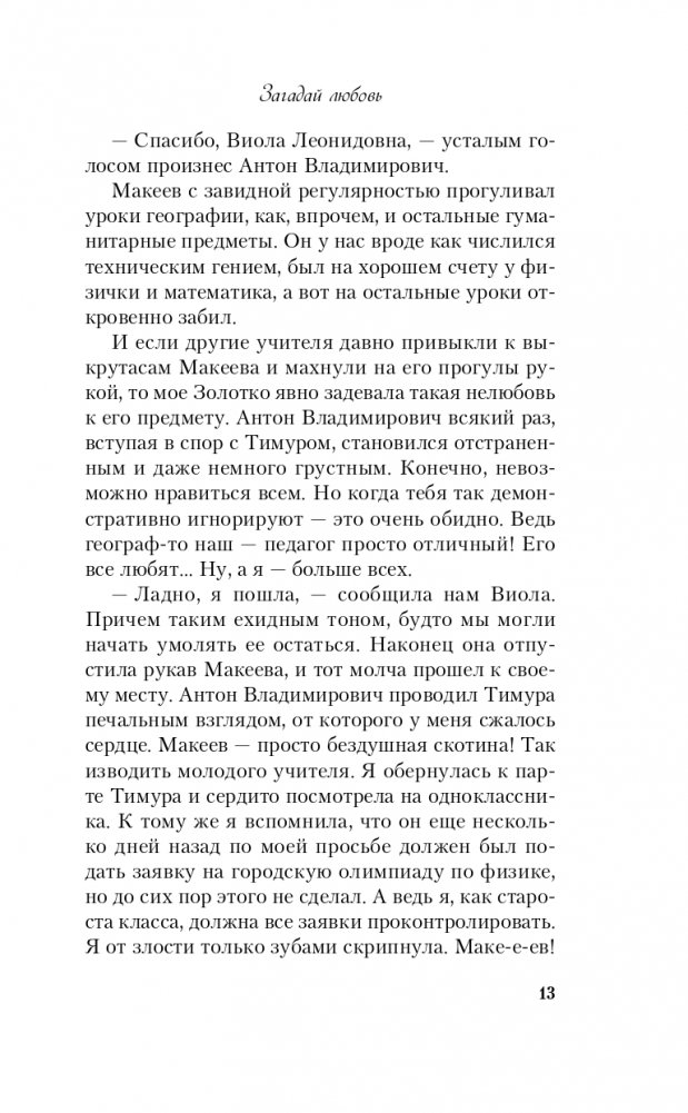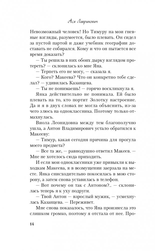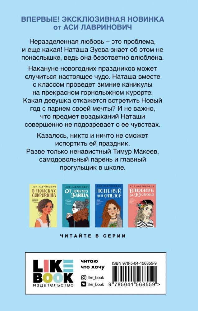 Впервые! Эксклюзив! Праздничная новогодняя новинка от Аси Лавринович! Неразделенная любовь — это проблема, и еще какая! Наташа Зуева знает об этом не понаслышке, ведь она безответно влюблена. Накануне новогодних праздников может случиться настоящее чудо. Наташа вместе с классом проведет зимние каникулы на прекрасном горнолыжном курорте. Какая девушка откажется встретить Новый год с парнем своей мечты? И неважно, что предмет воздыханий Наташи совершенно не подозревает о ее чувствах. Казалось, никто и ничто не сможет испортить ей праздник. Разве только ненавистный Тимур Макеев, самодовольный парень и главный прогульщик в школе. Ася Лавринович — один из самых популярных молодежных авторов. Суммарный тираж ее книг составляет более 100 000 экземпляров.