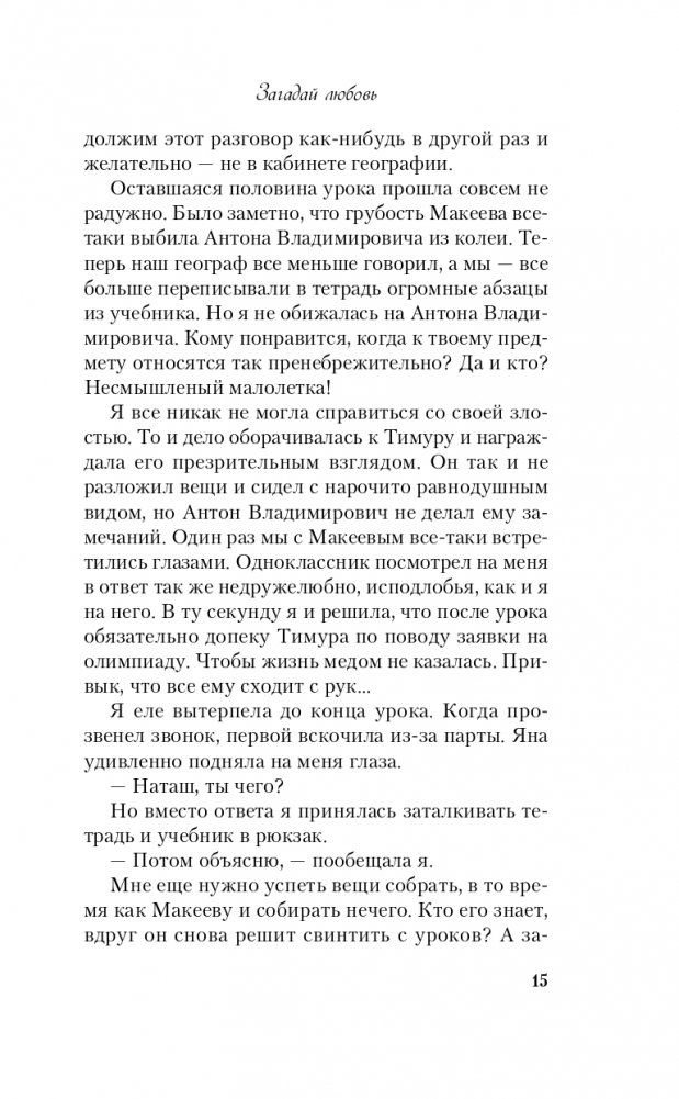 Неразделенная любовь – это проблема, и еще какая! Наташа Зуева знает об этом не понаслышке, ведь она безответно влюблена. Накануне новогодних праздников может случиться настоящее чудо. Наташа вместе с классом проведет зимние каникулы на прекрасном горнолыжном курорте. Какая девушка откажется встретить Новый год с парнем своей мечты? И неважно, что предмет воздыханий Наташи совершенно не подозревает о ее чувствах. Казалось, никто и ничто не сможет испортить ей праздник. Разве только ненавистный Тимур Макеев, самодовольный парень и главный прогульщик в школе.