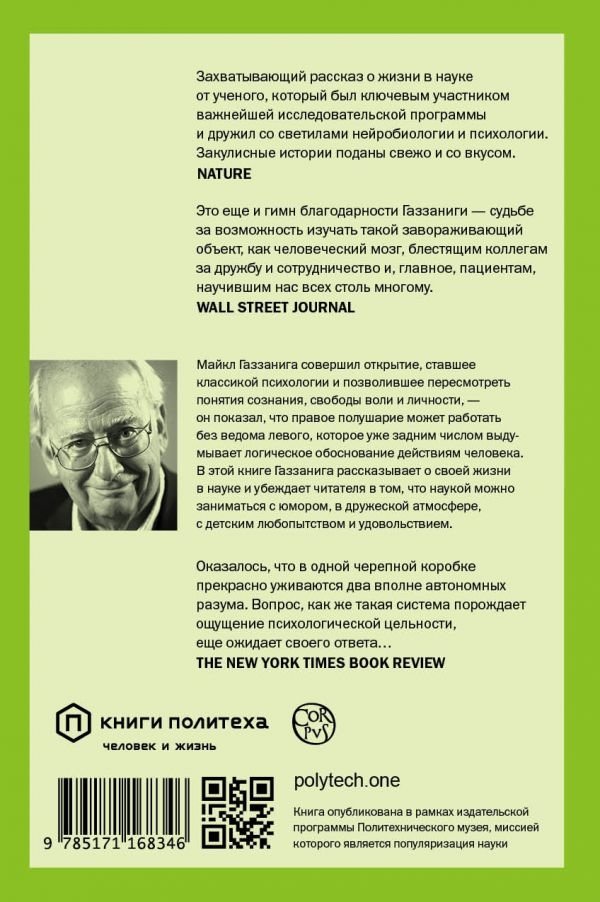 Майкл Газзанига, один из самых авторитетных нейробиологов XX века, рассказывает о своей фундаментальной работе по изучению невероятной пары — правого и левого полушарий. Один из отцов когнитивной нейронауки описывает, как зародилась революционная теория расщепленного мозга, когда правая и левая его половины после разъединения начинают функционировать независимо друг от друга и проявляют совершенно разные умения. Газзанига убежден, что популярное представление, будто наука делается гениями-одиночками, неверно. Его истории показывают человеческое лицо науки: ею движет дружба, она результат многочисленных социальных взаимодействий между самыми разными людьми, зачастую происходящих вне стен лабораторий и кабинетов.