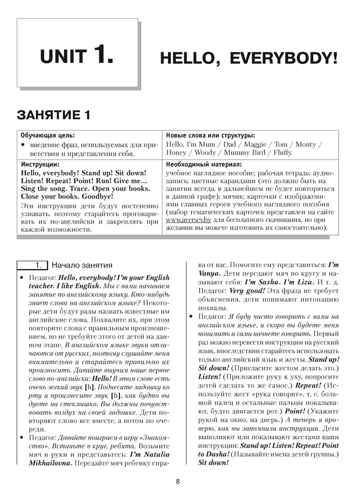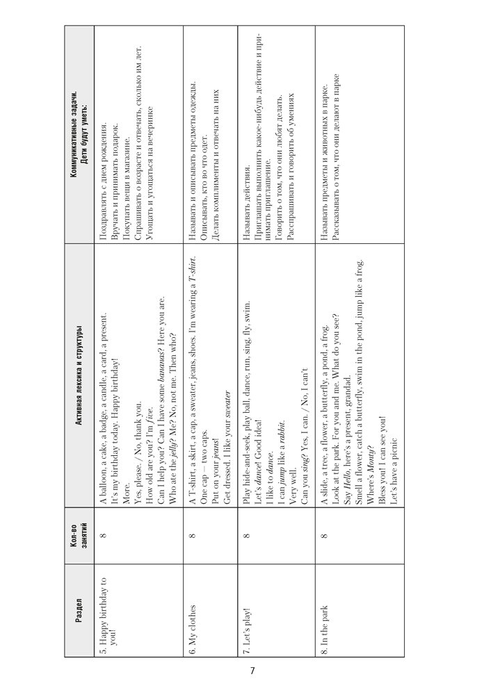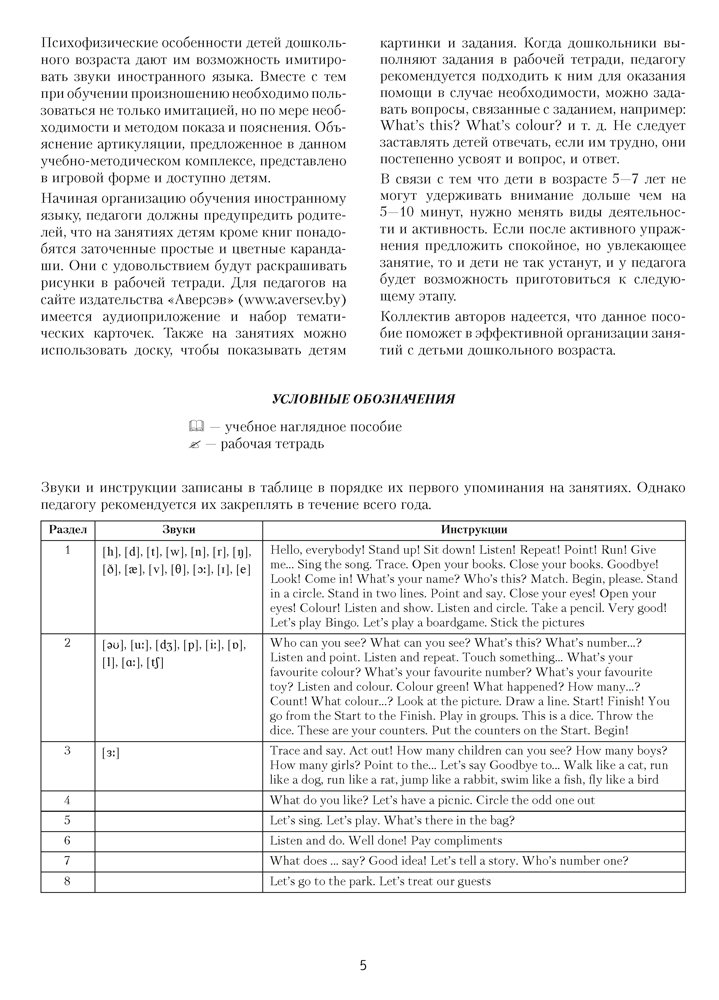 Пособие содержит конспекты занятий по обучению иноязычному общению воспитанников старшей группы (от 5 до 7 лет), способствующие реализации задач образовательной области «Развитие речи и культура речевого общения (иностранный язык)» учебной программы дошкольного образования.
