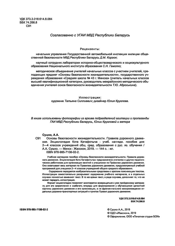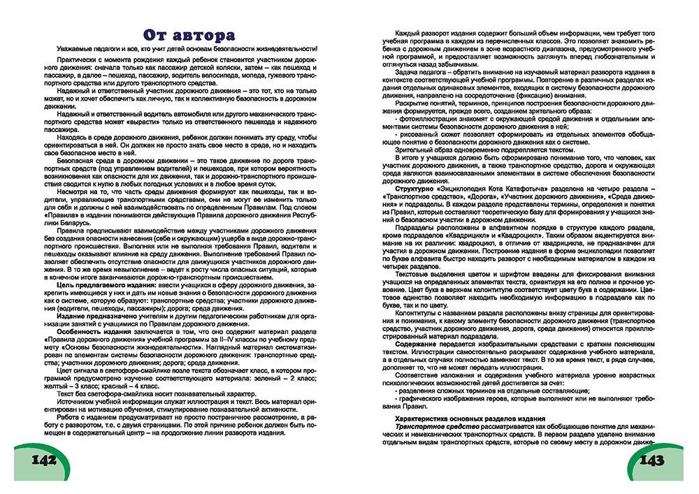 Учебное наглядное пособие «Энциклопедия Кота Катафотыча» (адресуется педагогам преподающим учебный предмет «Основа безопасности жизнедеятельности») охватывает весь материал по Правилам дорожного движения предусмотренный учебной программой для учащихся 2—4 классов учреждений общего среднего образования.