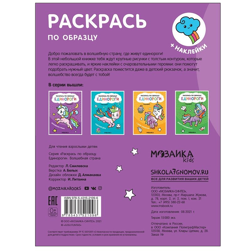 Вы хотите узнать, где обитают сказочные герои — единороги, принцессы, русалки и пушистые ламы? Что ж, приглашаем в путешествие по страницам книжки, созданной специально для маленьких художников, которые верят в чудеса. В ней вас ждут 8 симпатичных картинок с крупными наклейками-подсказками — они помогут ребенку с выбором цвета. Раскрашивая сказочных героев, он весело и с пользой проведет время дома, в гостях, в дороге — где угодно: книжки небольшого формата легко поместятся даже в детский рюкзачок. Занятия с книжками серии «Раскрась по образцу. Единороги» не только способствуют развитию творческих способностей, внимания и мелкой моторики.