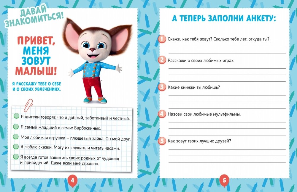 Малыш Барбоскин – самый младший в семье. Он любит играть и веселиться и обожает проводить время со старшими. Как и Гене, Малышу нравится узнавать новое. Он любит гонять мяч с Дружком. А вместе с Розой и Лизой рисует, готовит и рукодельничает. Если у тебя тоже множество увлечений, эта хобби-тетрадь для тебя! Заполни её вместе с Малышом, и ты узнаешь больше о космосе, мультфильмах и старинных игрушках, смастеришь подарок для бабушки и дедушки, приготовишь горячие бутерброды и выяснишь, что такое неньютоновская жидкость. Ты создашь вулкан из пластилина и сыграешь в мемори. А ещё тебя ждут раскраски, интересные задания, головоломки и истории про Барбоскиных!