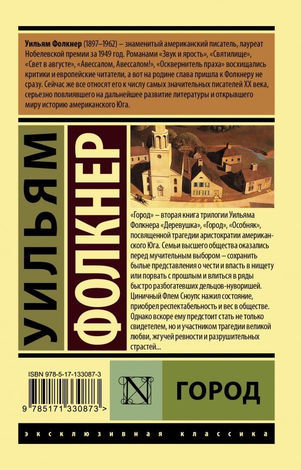«Город» – вторая книга трилогии Уильяма Фолкнера «Деревушка», «Город», «Особняк», посвященной трагедии аристократии американского Юга. Семьи высшего общества оказались перед мучительным выбором – сохранить былые представления о чести и впасть в нищету или порвать с прошлым и влиться в ряды быстро разбогатевших дельцов-нуворишей.